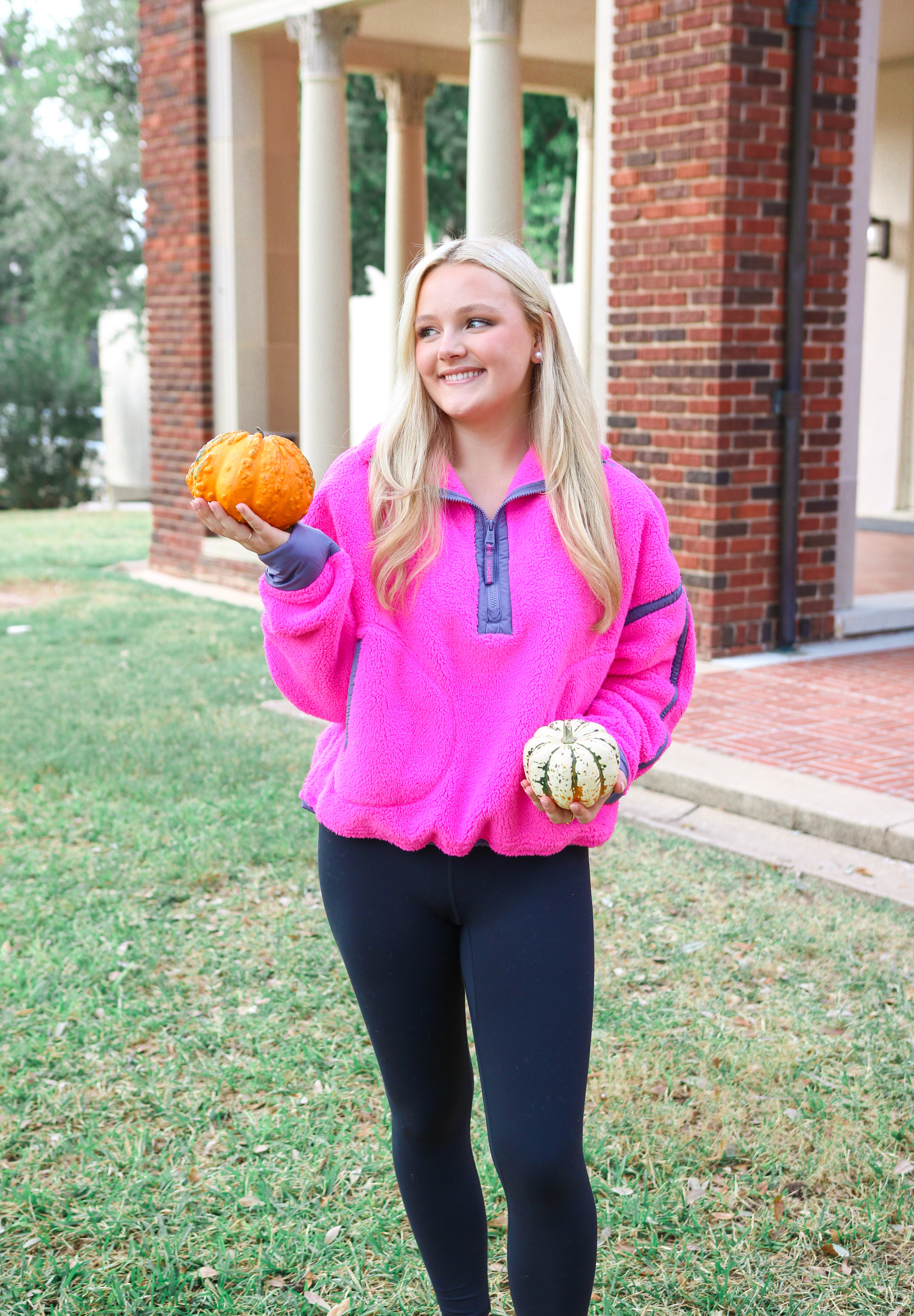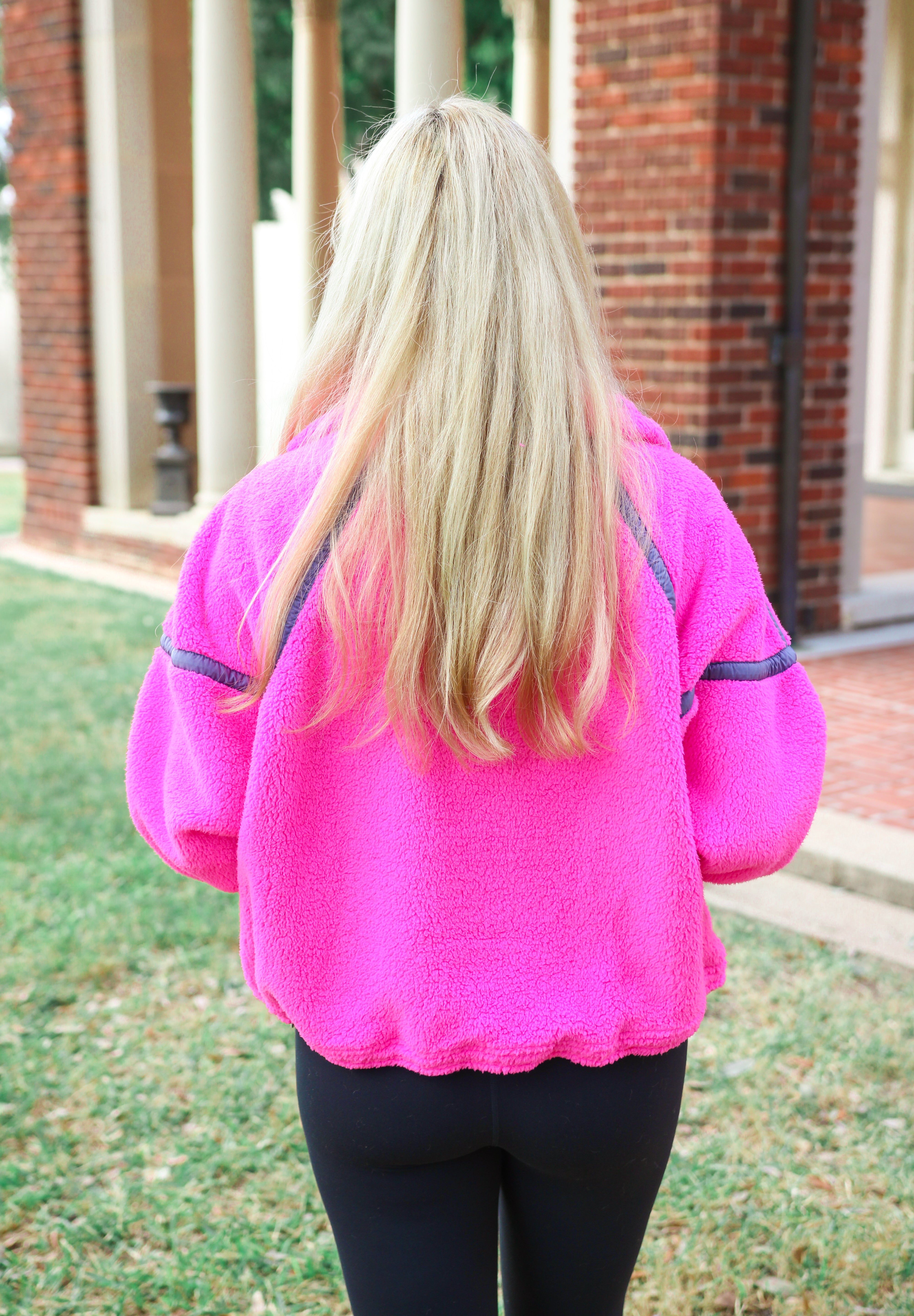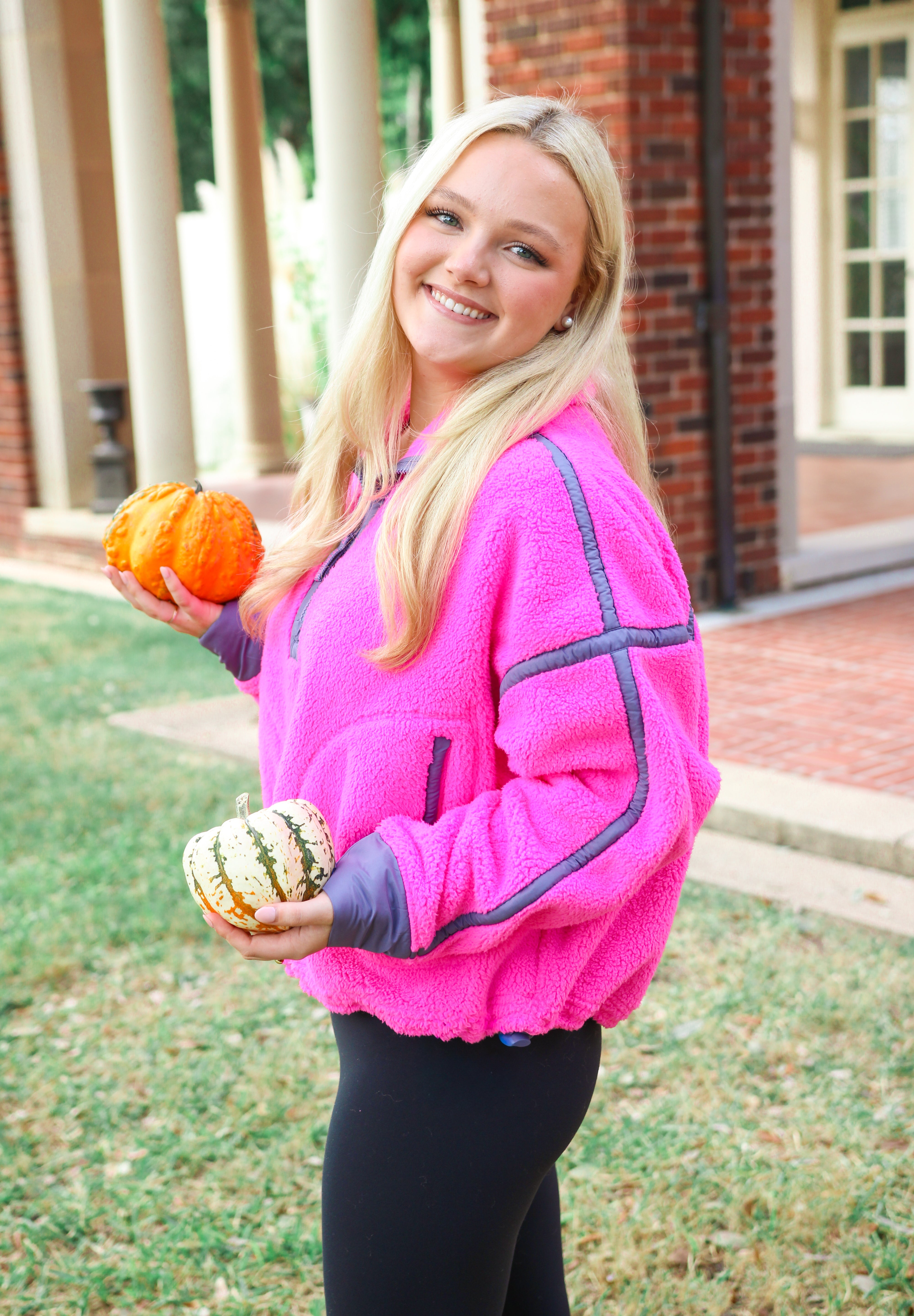 Cozy fleece pullover featuring a half-zip closure and high neckline with bold contrast seams throughout and an adjustable hemline.