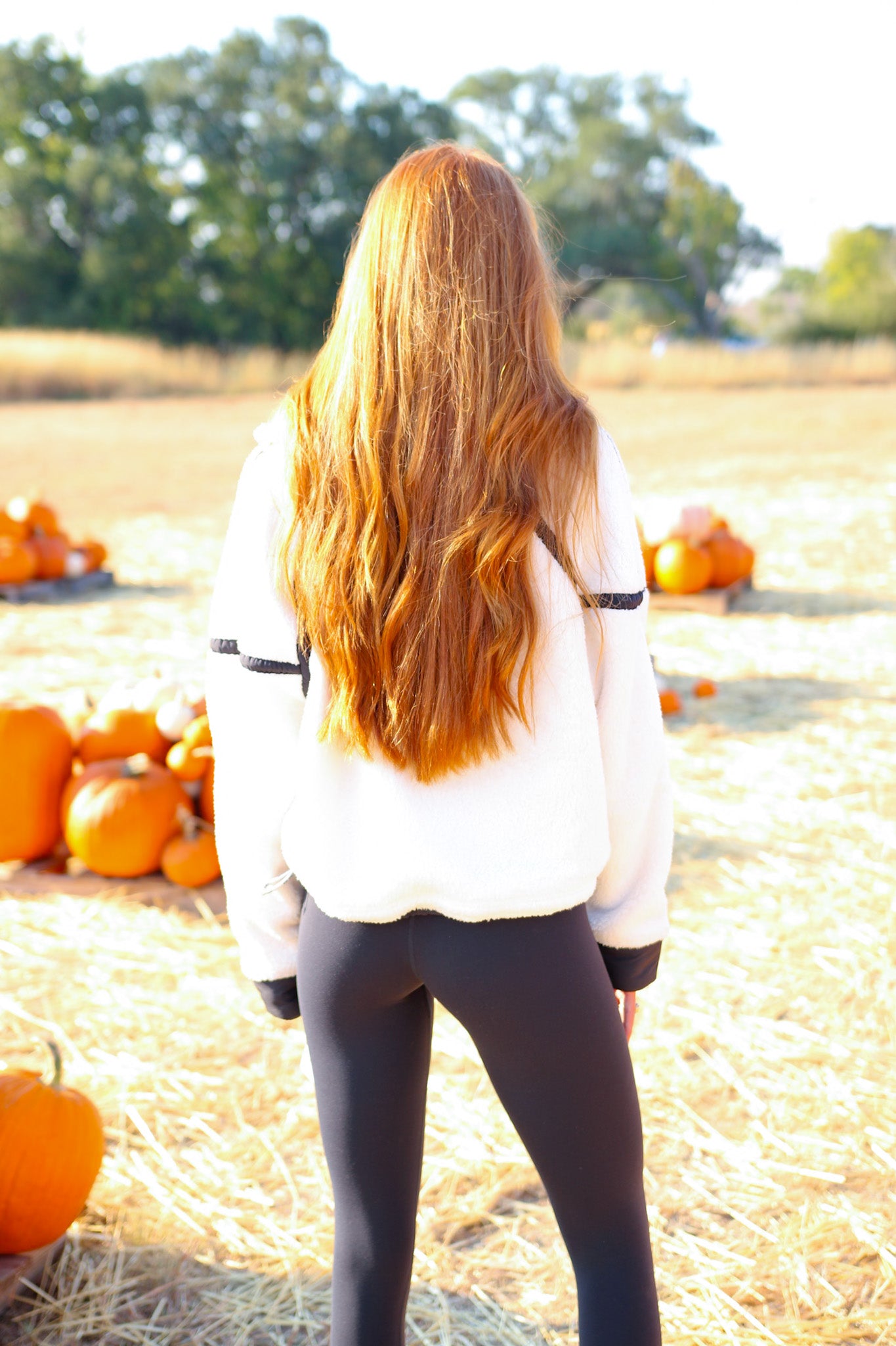 Cozy fleece pullover featuring a half-zip closure and high neckline with bold contrast seams throughout and an adjustable hemline.