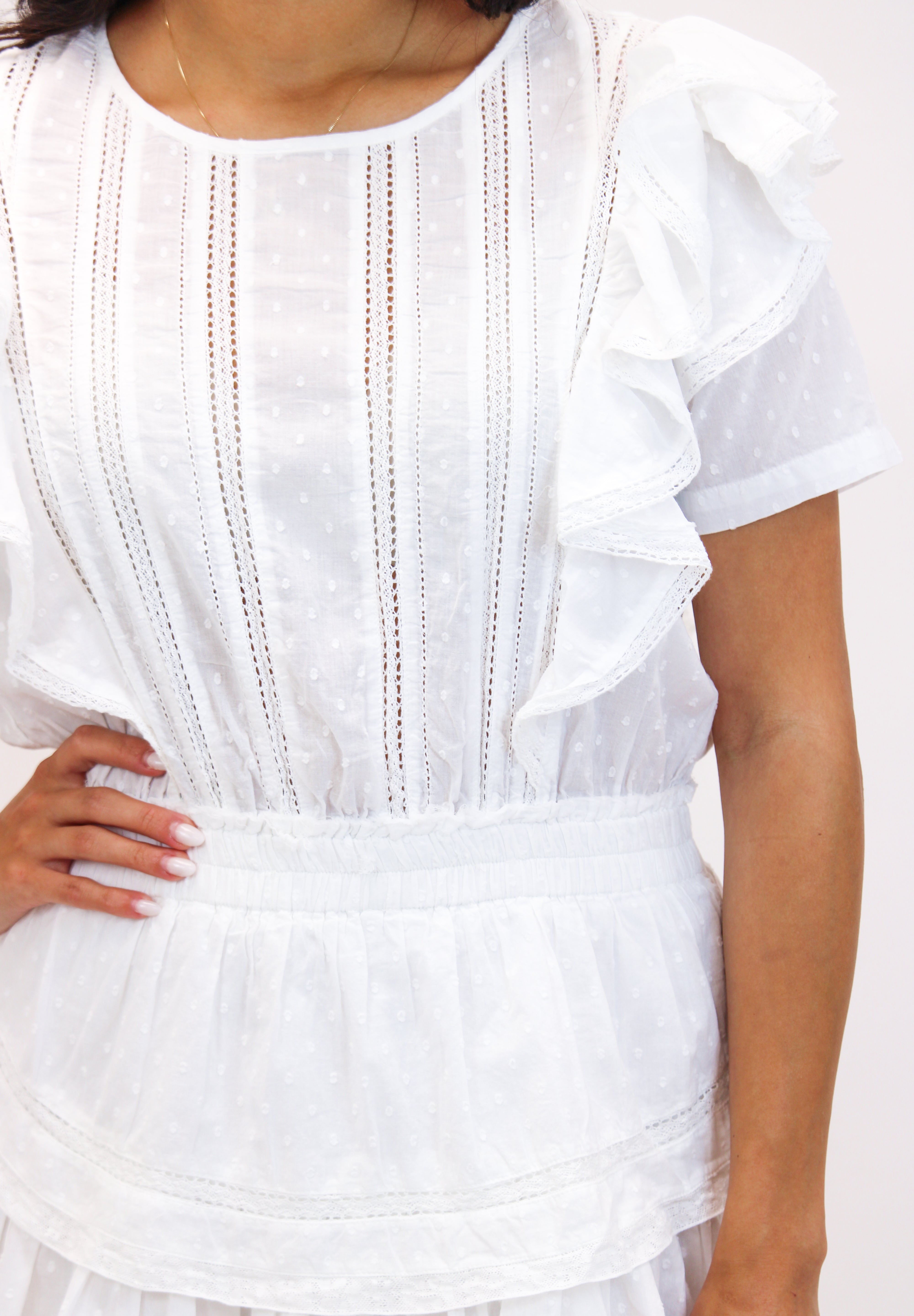 Part of our Heritage Collection the Natasha dress features double ruffled flutter sleeves which cascade down the front and back of the body to highlight the elasticated waist. Intricate inset lace trims add an air of femininity and ease.
