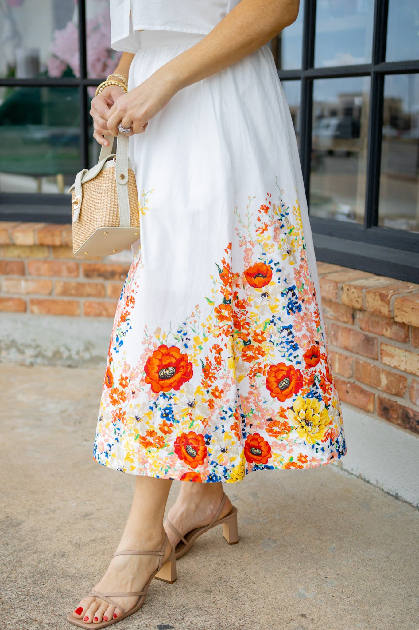 Twirl through your day in this delightful poppy picnic skirt, where whimsical florals dance across off-white fabric. The midi length offers timeless elegance with a modern twist, while the elastic waistband ensures all-day comfort and ease of movement. Partially lined for a polished feel without extra bulk. Whether you're heading to brunch or a garden stroll, this cheerful piece brings effortless charm to any occasion.