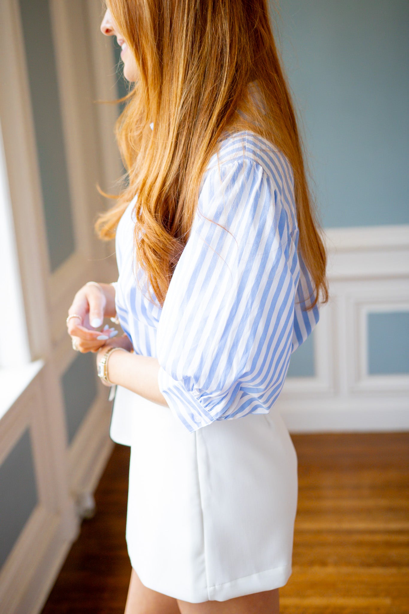 Bring effortless charm to your wardrobe with this striped button-down that's equal parts fun and flattering. Featuring bold blue and white stripes, puffed sleeves, and a cropped silhouette, it's the perfect piece for layering or wearing solo. The 3/4 length sleeves hit just right, while classic buttons keep things polished. Whether you're dressing up or keeping it casual, this versatile top delivers style with a wink.