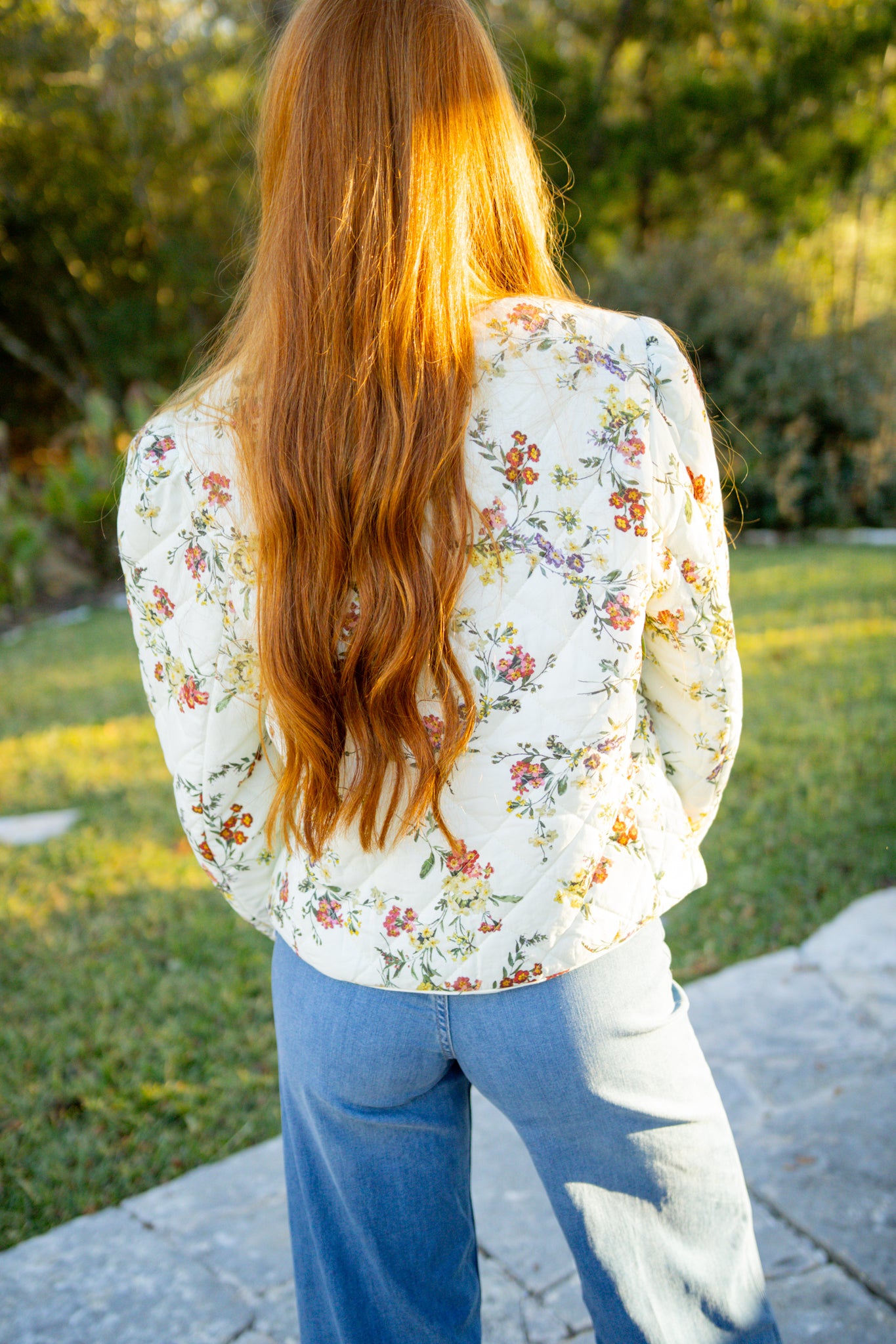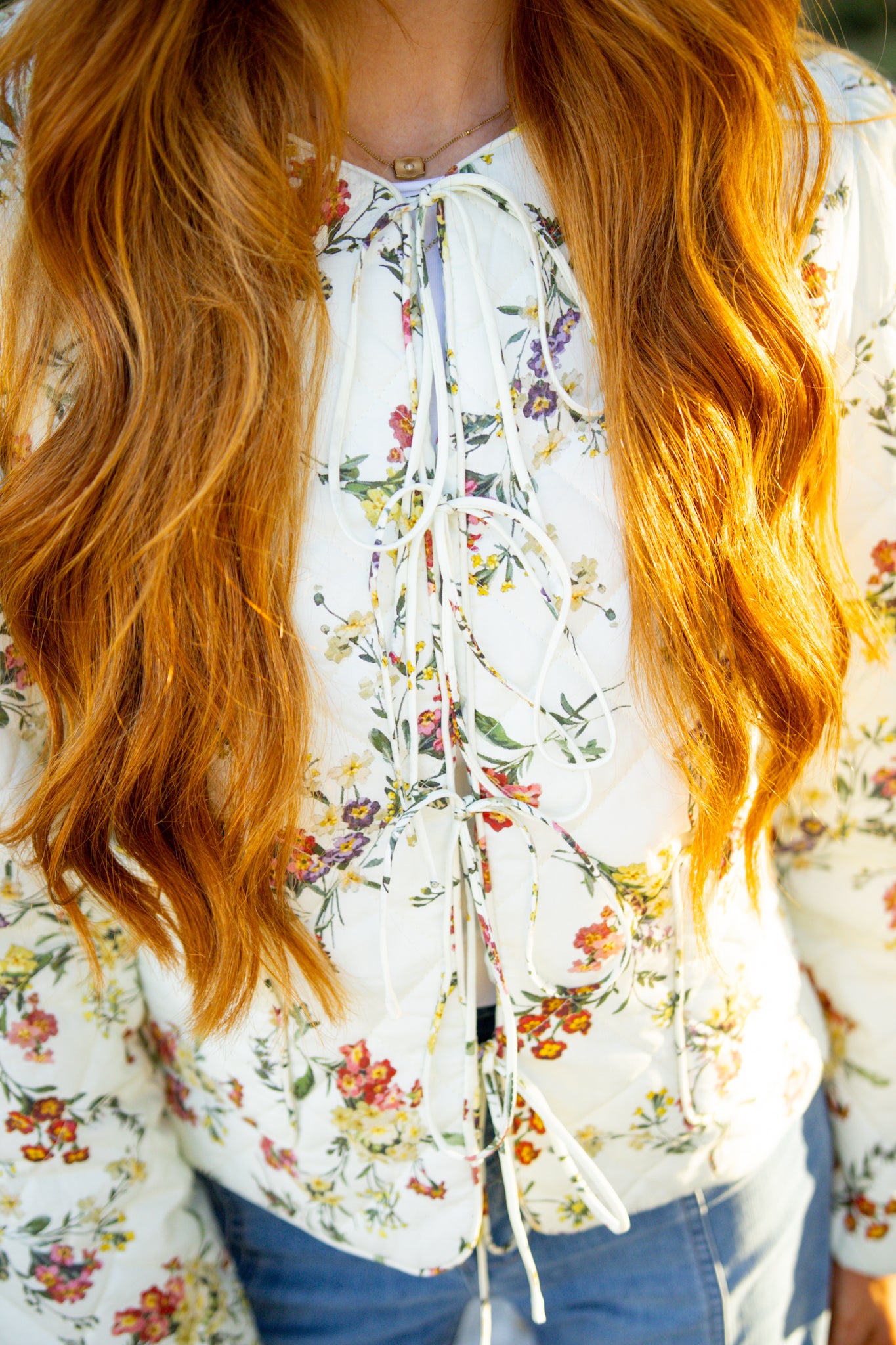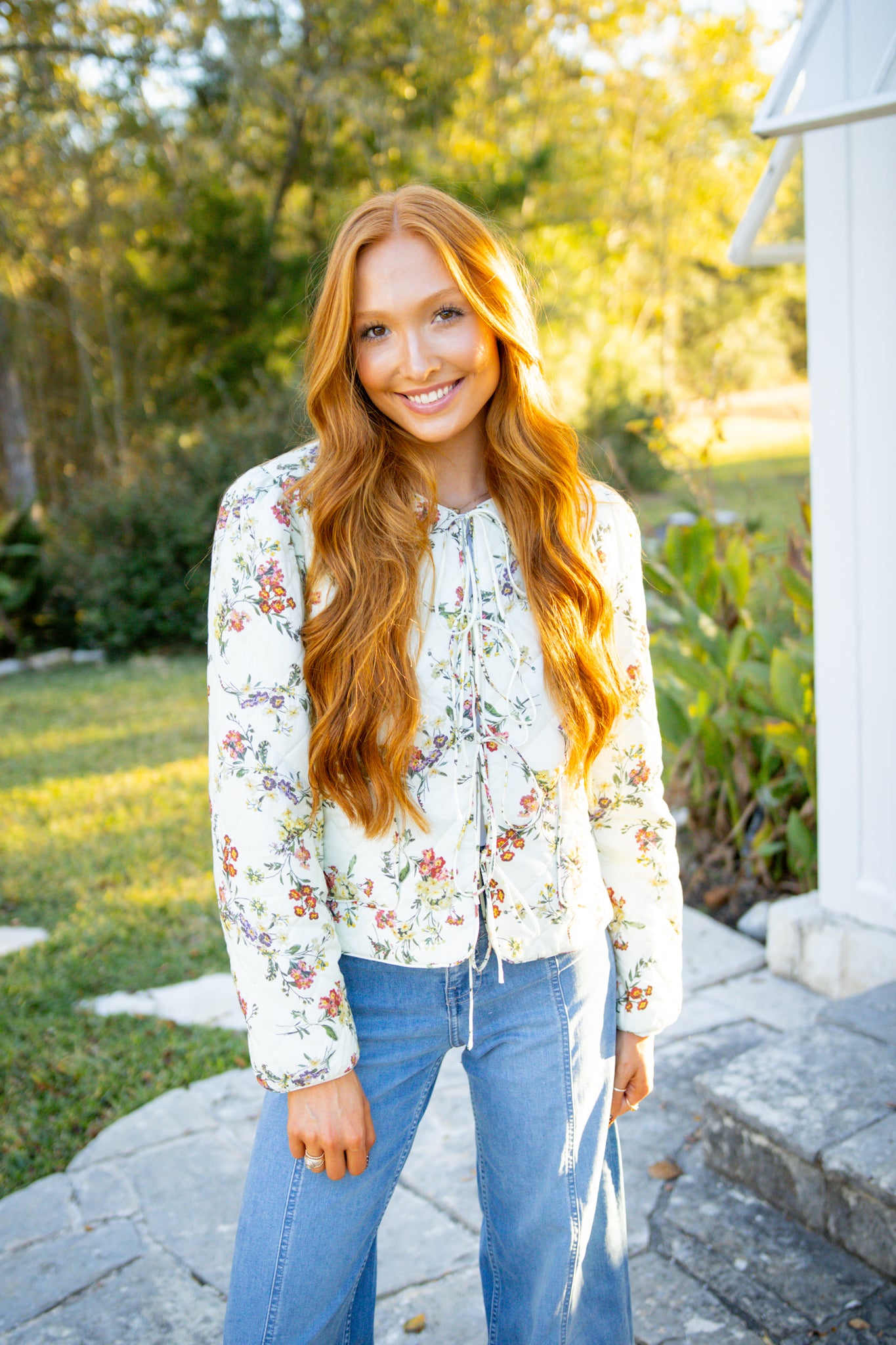 Elevate your everyday style with this charming quilted jacket that's equal parts cozy and chic. Featuring a delicate floral print layered over a diamond quilted texture, it's the perfect lightweight layer for transitional weather. The playful self bow tie closure adds a touch of personality, while practical patch pockets keep your essentials within reach. Fully lined and crafted from woven fabric, this non-sheer piece transitions seamlessly from brunch to errands. A wardrobe essential that proves quilted jackets can be anything but basic.