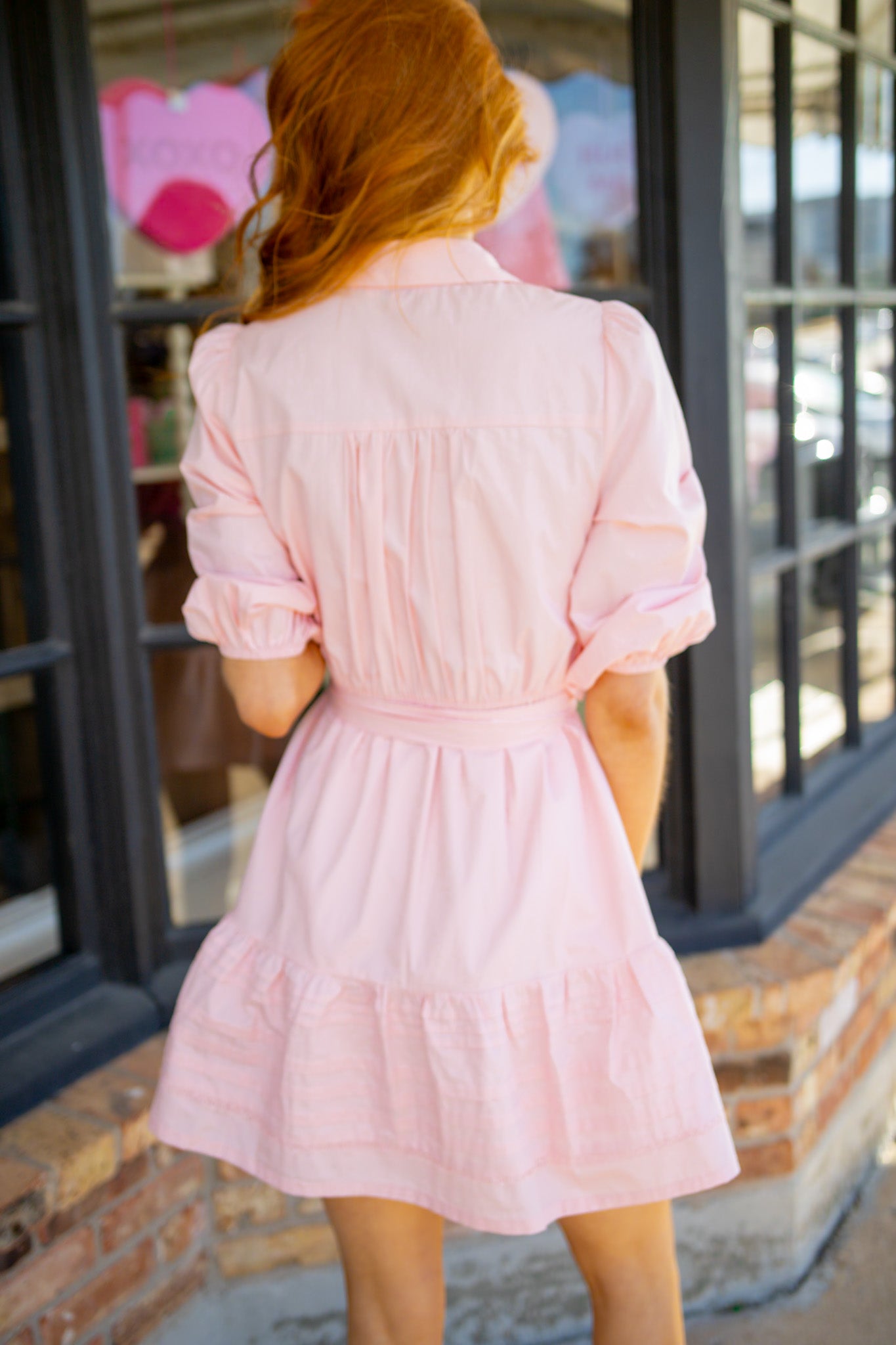 Blush your way through the day in this charming mini dress that's equal parts sweet and sophisticated. Featuring a classic collar and long sleeves, it's the perfect piece for layering or standing solo. The front showcases delicate lace detailing that catches every eye, while functional running buttons guide you from neckline to hem for easy styling versatility. A built-in belt cinches the waist for a flattering silhouette that keeps you looking polished. Whether you're heading to brunch or a casual date night, this pink stunner brings effortless elegance with a playful twist.