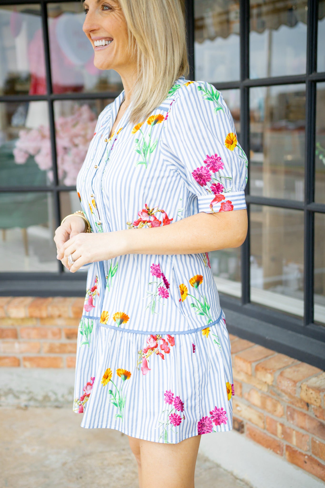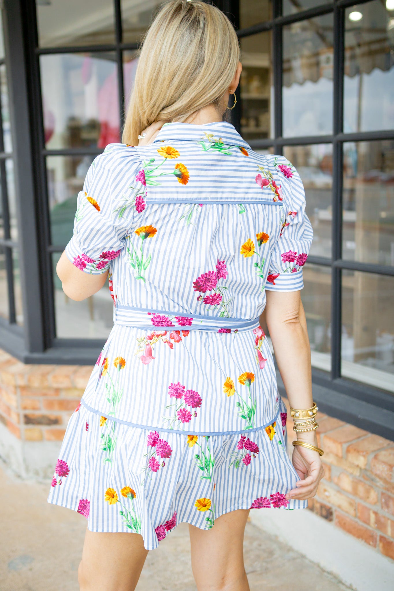 Escape to effortless style in this charming mini dress that blends classic and contemporary details. The crisp blue and white striped base provides a fresh foundation, while vibrant florals dance across the fabric for a whimsical touch. Puff sleeves add romantic flair, and the collared neckline keeps things polished. Gold buttons and a tie waist belt cinch your silhouette, while hidden side pockets offer practical charm. Fully lined for comfort and confidence, this button-up dress transitions seamlessly from brunch to evening adventures.