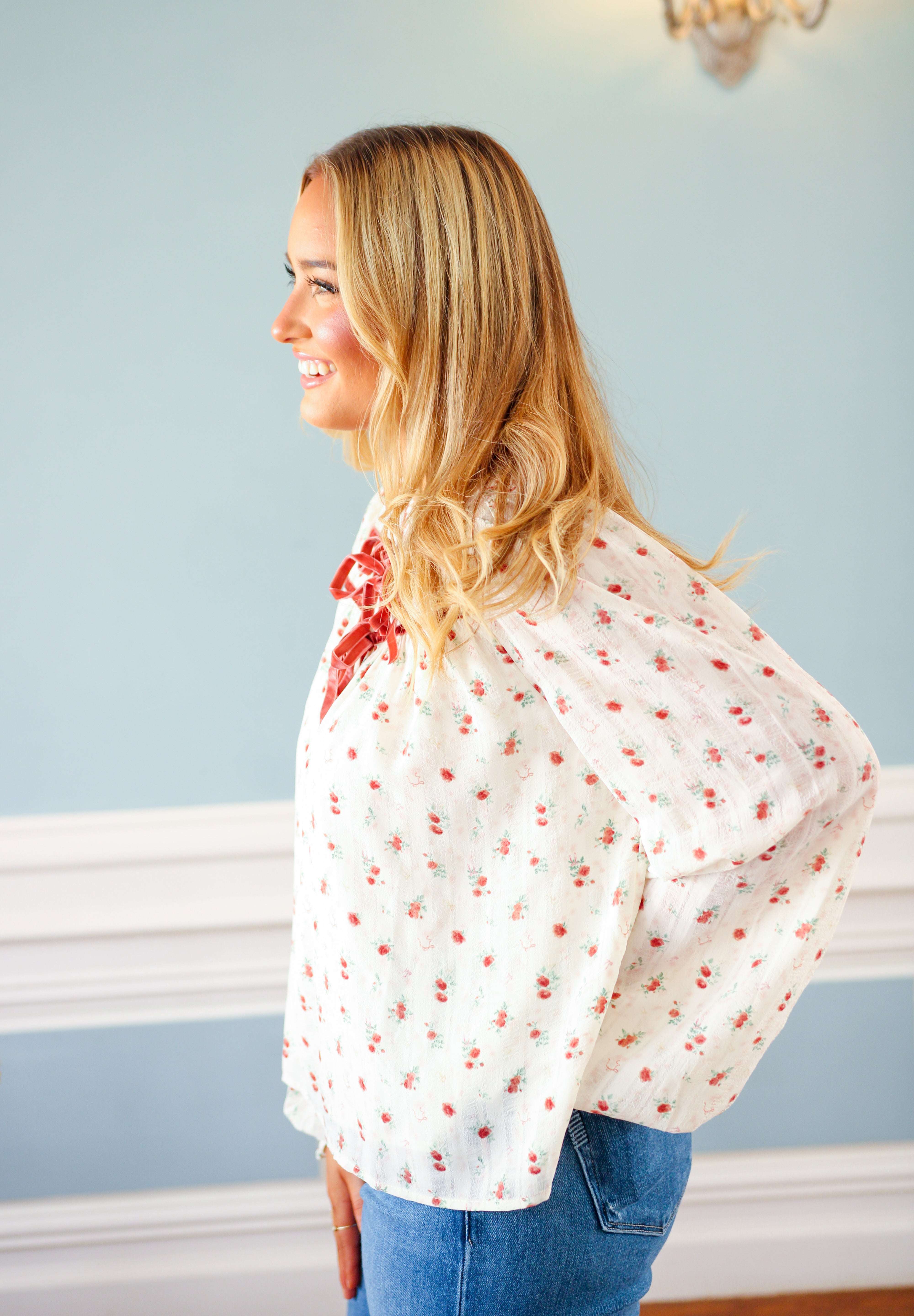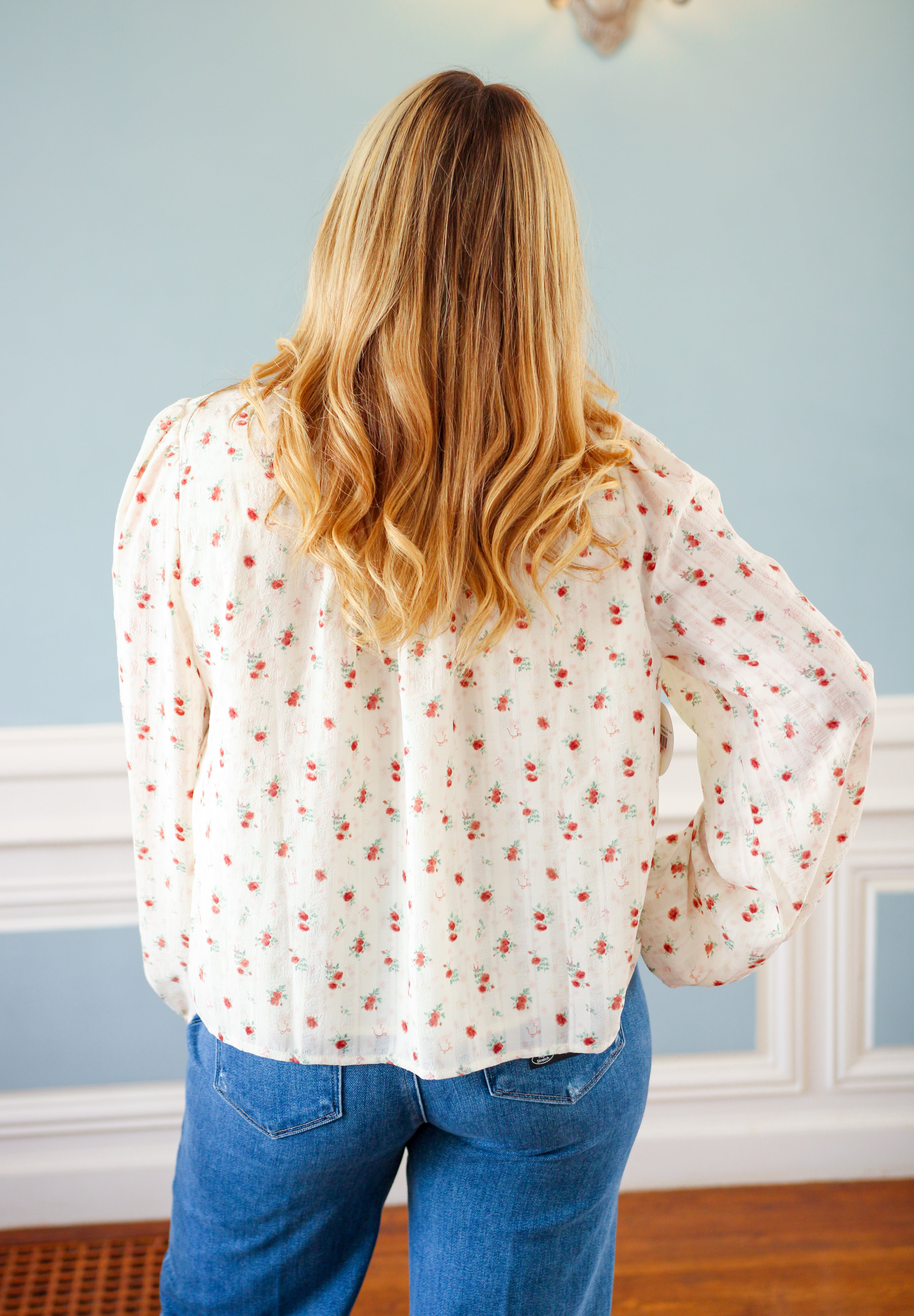 Embrace the charm of breezy fall days with the Sweet Meadow Morning Top in Cream. Its soft velvet tie and delicate ruffle details bring a playful touch to the floral design, perfect for layering as the season turns cozy. This blouse adds a light, whimsical step to your autumn wardrobe.