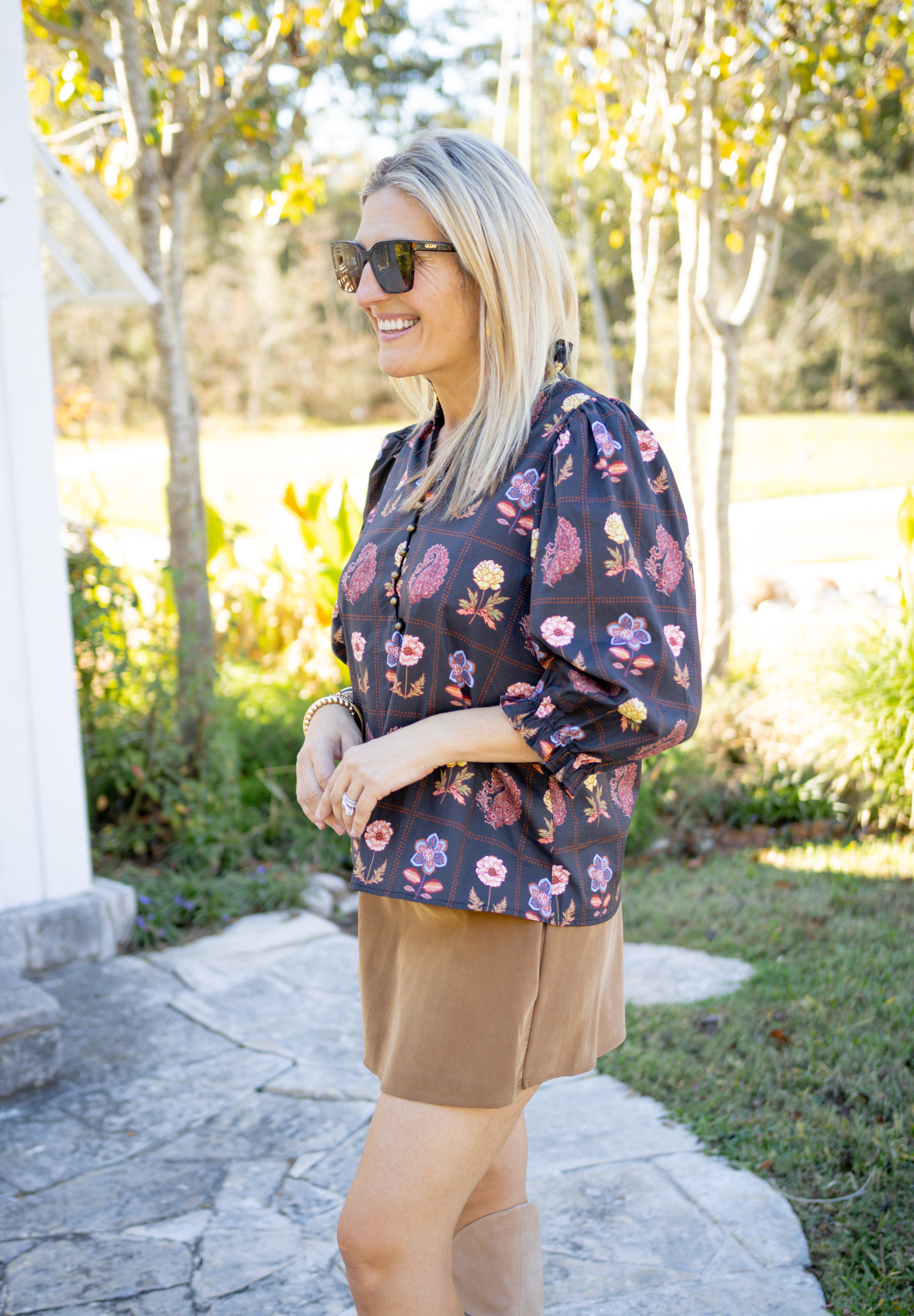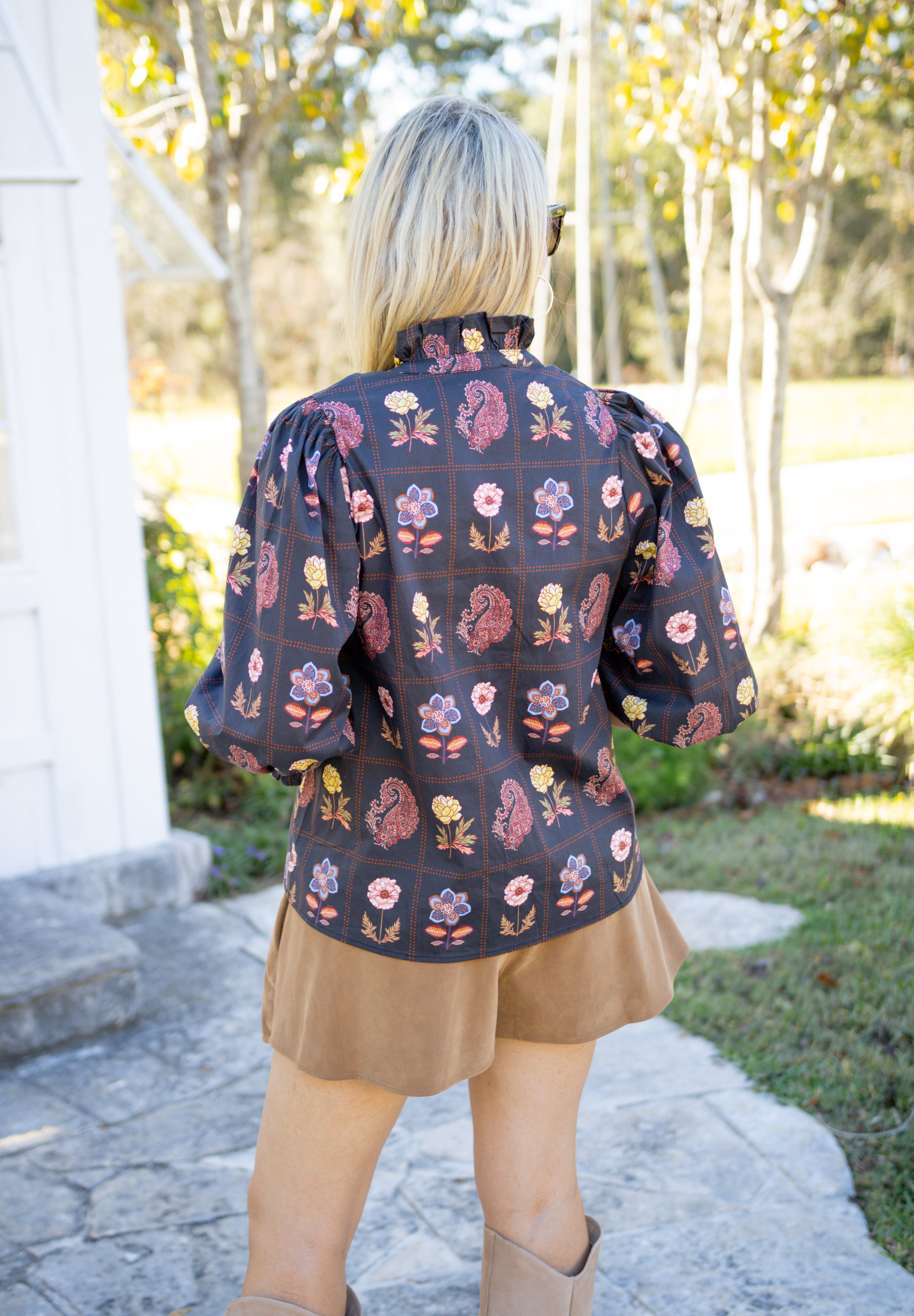Elevate your wardrobe with this charming floral and paisley print top that's equal parts romantic and fun. The ruffled high neck and loop button closure add vintage-inspired flair, while the 3/4 puff sleeves create a playful silhouette. Elasticated sleeve openings with ruffle trim keep things comfortable and on-trend. Crafted from lightweight, non-sheer woven fabric and left unlined for breathability, this piece is perfect for layering or wearing solo. A delightful addition to any closet.