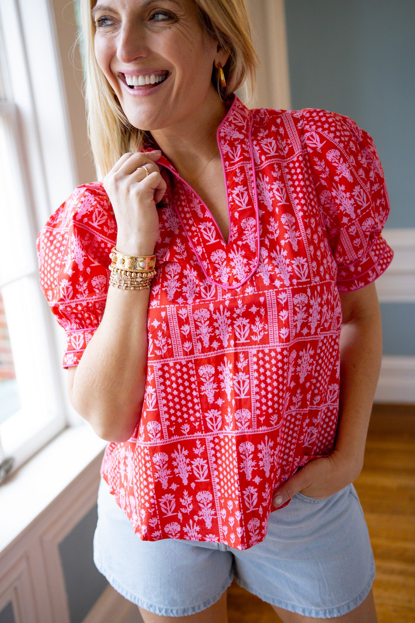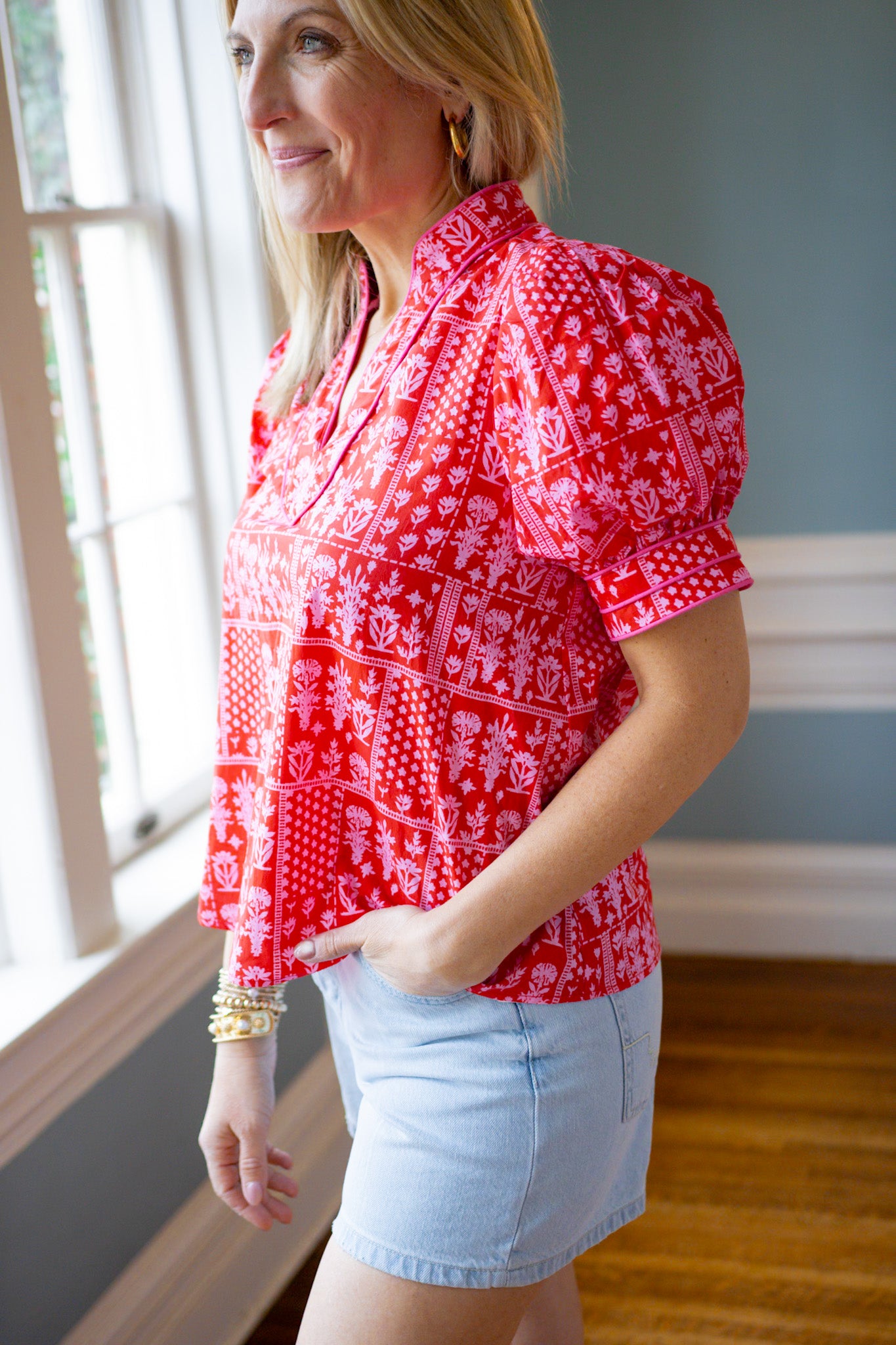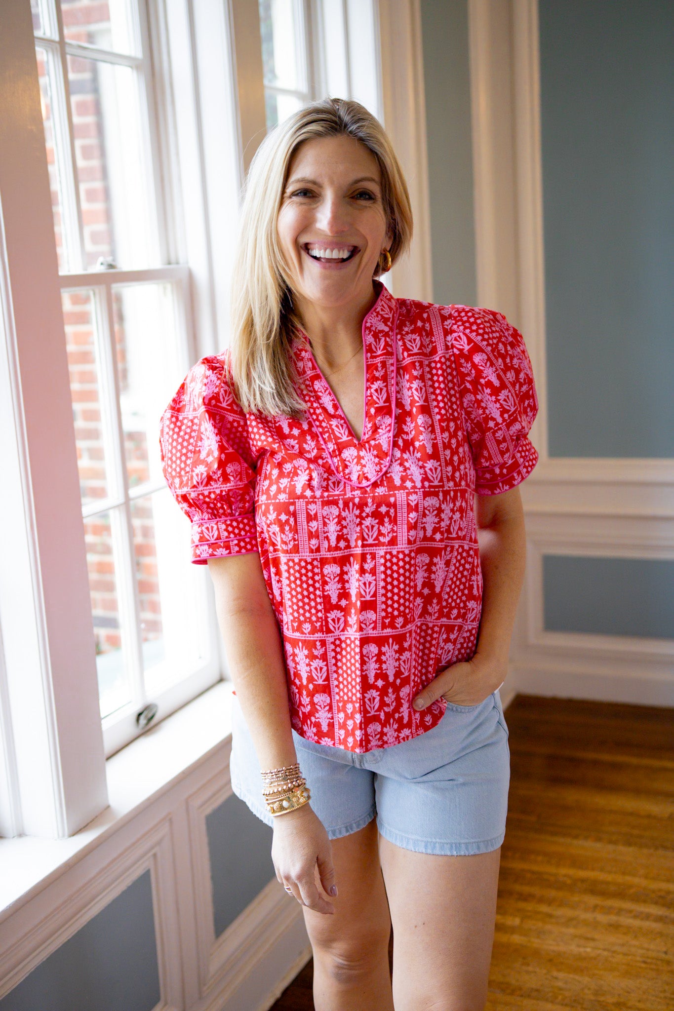 Romantic vibes meet modern style in this True Romance Floral Top. Featuring a gorgeous floral and tile pattern in red and pink tones, the flattering V-neckline is elevated with delicate accent piping for a polished finish. Perfect for date night, brunch, or whenever you want to feel effortlessly chic. A playful piece that celebrates color and pattern with confidence.