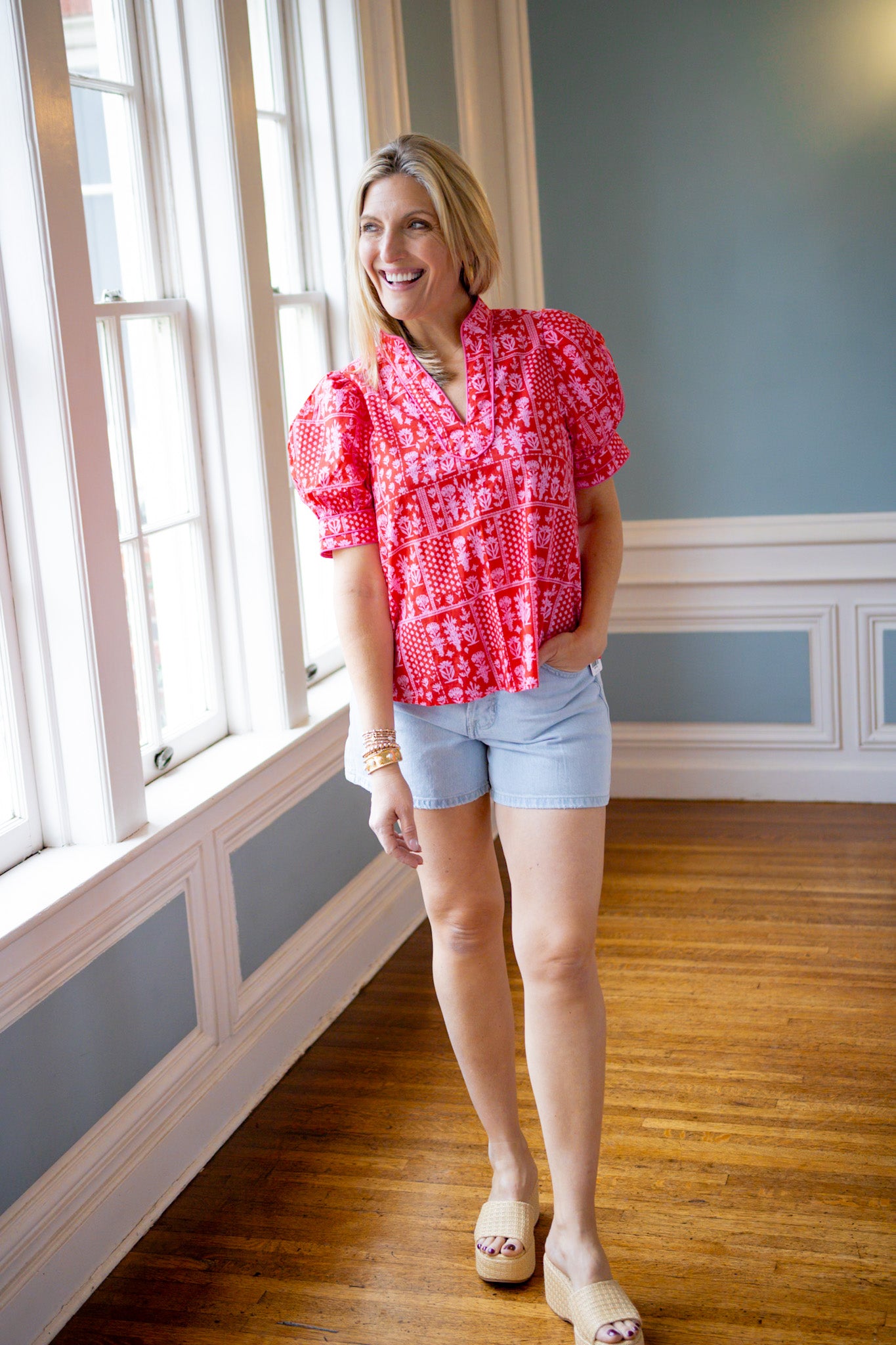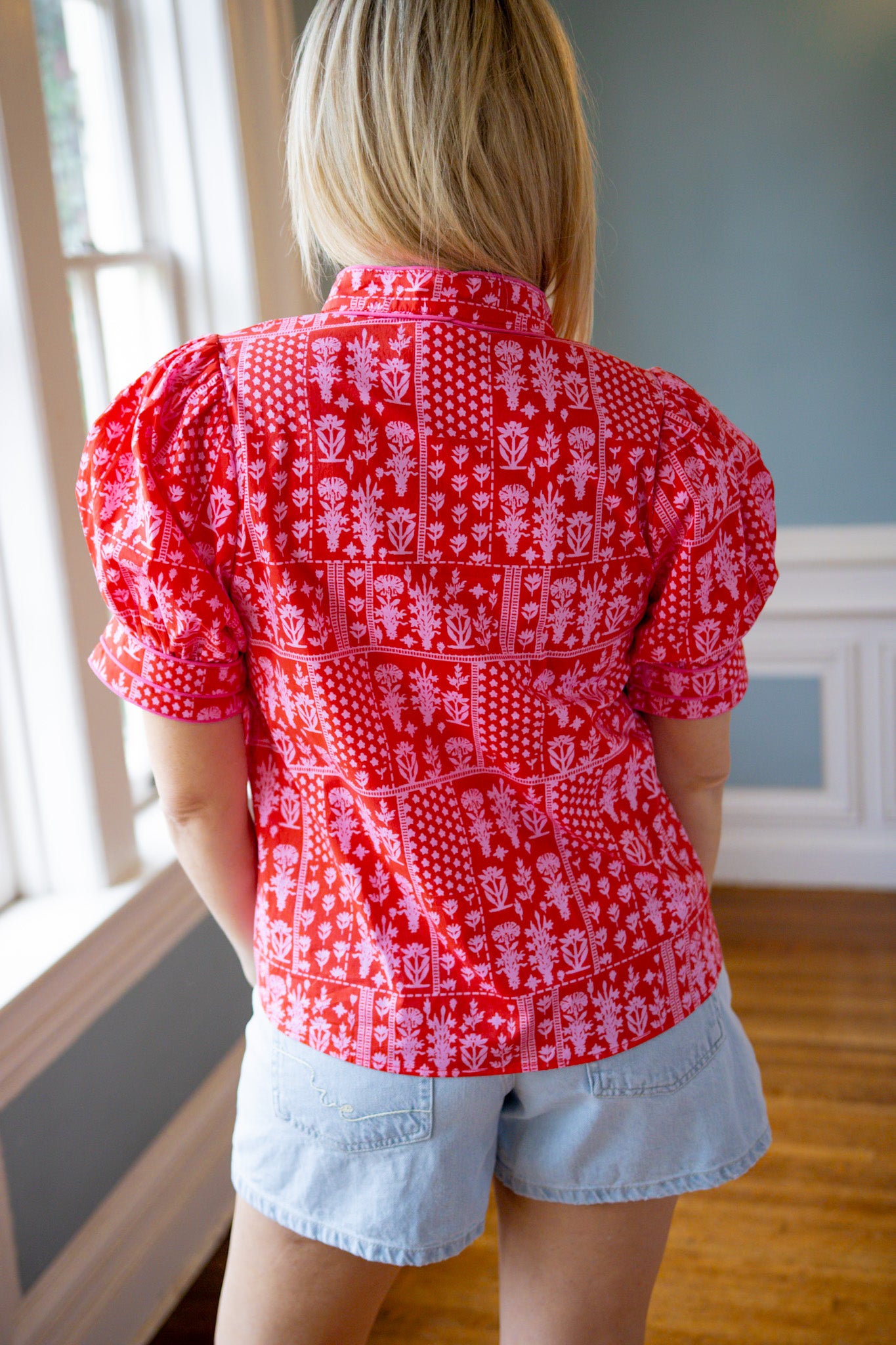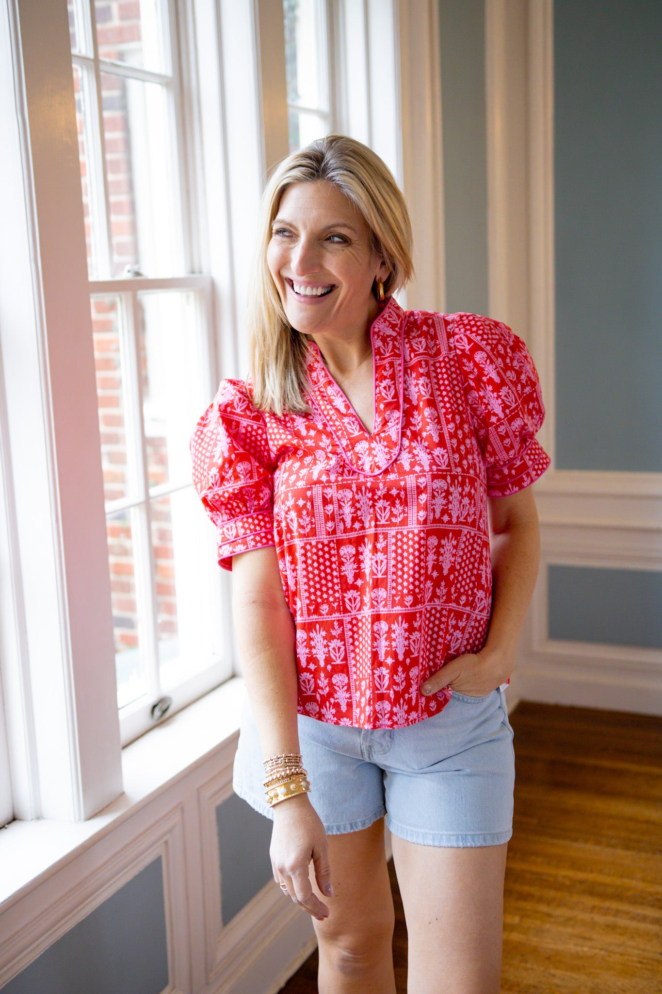 Romantic vibes meet modern style in this True Romance Floral Top. Featuring a gorgeous floral and tile pattern in red and pink tones, the flattering V-neckline is elevated with delicate accent piping for a polished finish. Perfect for date night, brunch, or whenever you want to feel effortlessly chic. A playful piece that celebrates color and pattern with confidence.