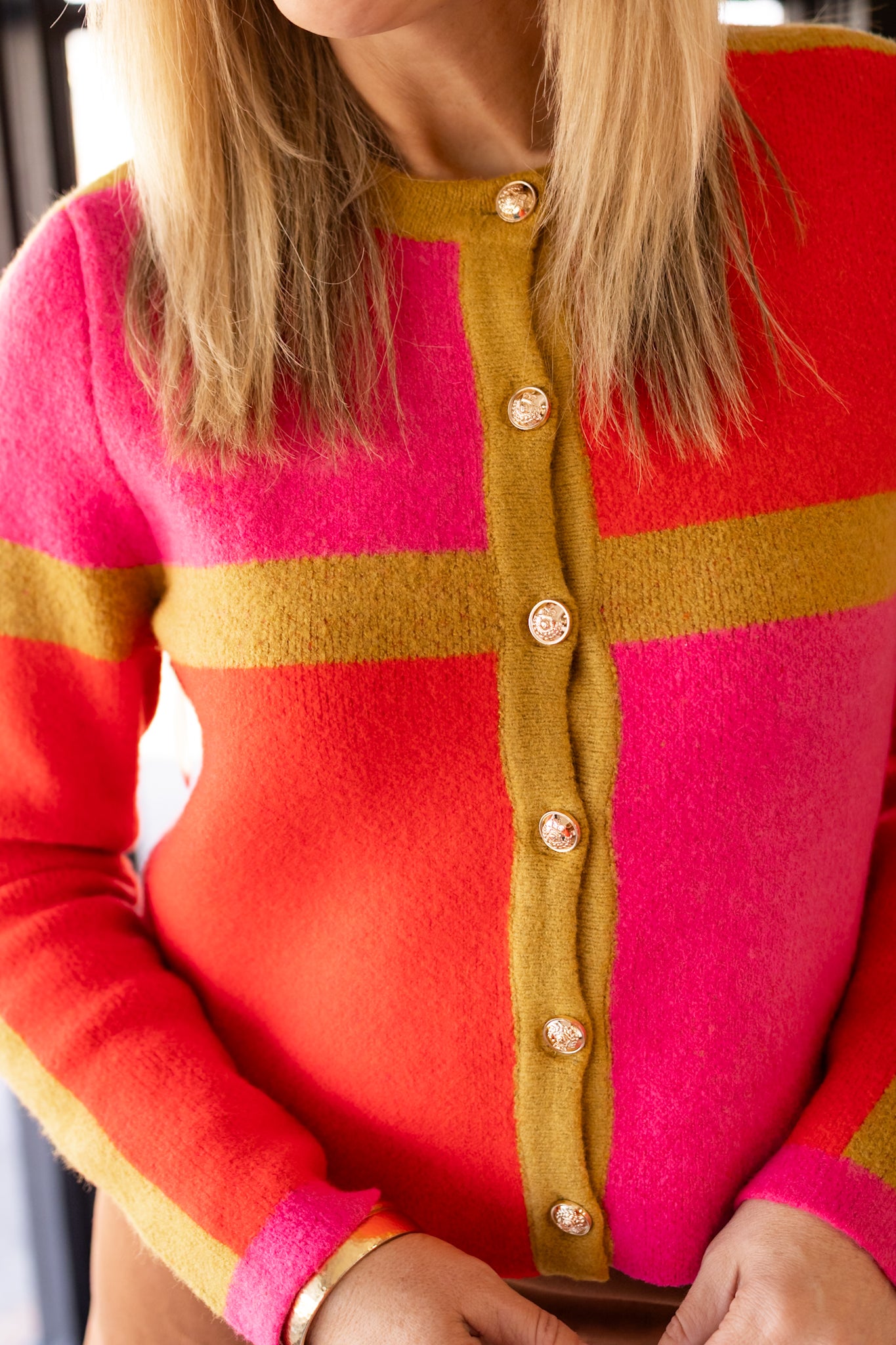 Make a statement with this color block cardigan, where vibrant energy meets refined style. This cropped knit features a striking geometric mix of fuchsia pink, bright orange-red, and chartreuse green that instantly transforms any outfit. The modern cropped silhouette pairs effortlessly with high-waisted jeans, tailored trousers, or slip dresses for layered looks. Polished gold-tone dome buttons add vintage-inspired charm, while the soft, substantial knit fabric keeps you cozy without compromising on style. Perfect for anyone ready to embrace bold color and playful confidence.