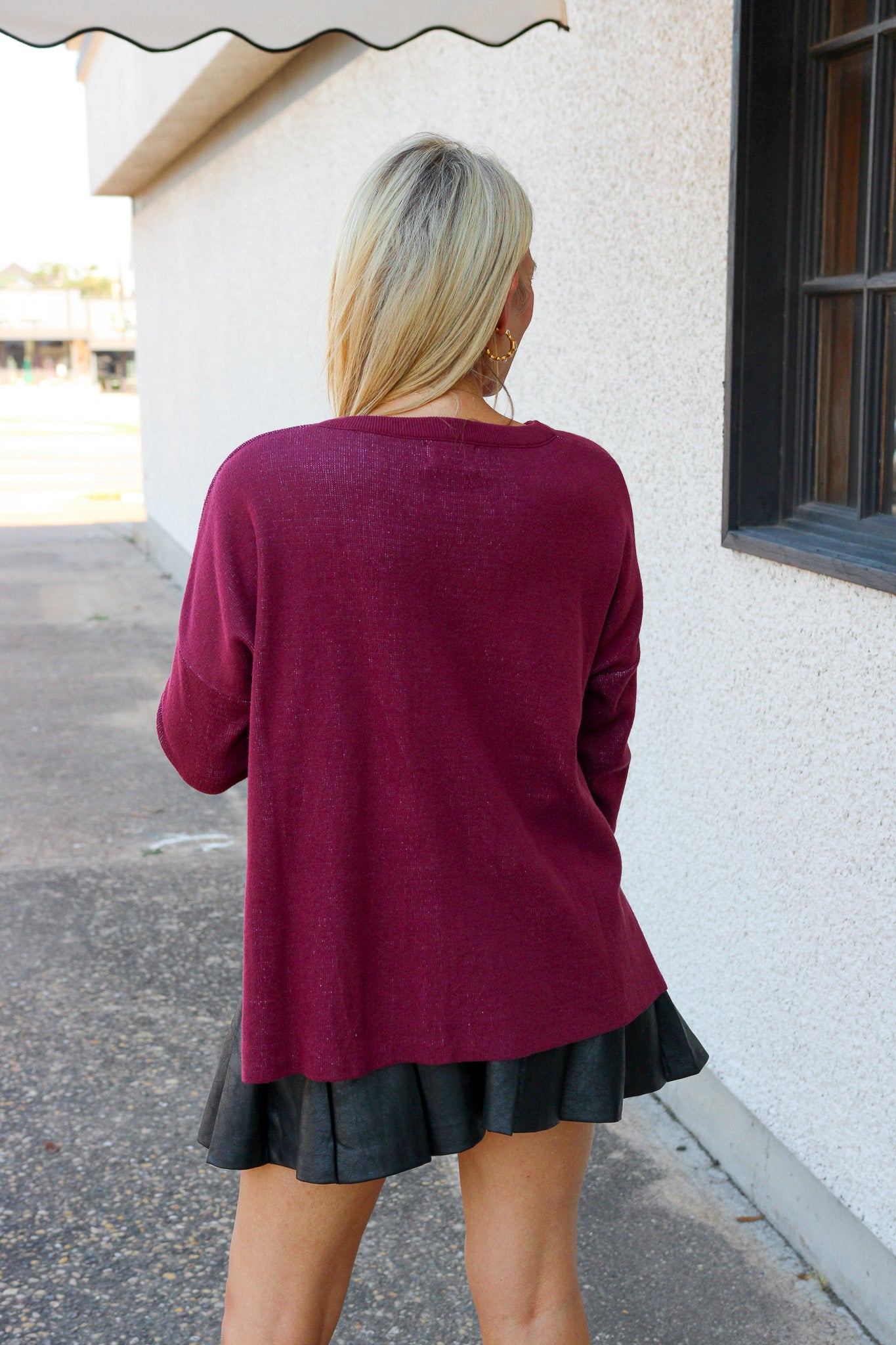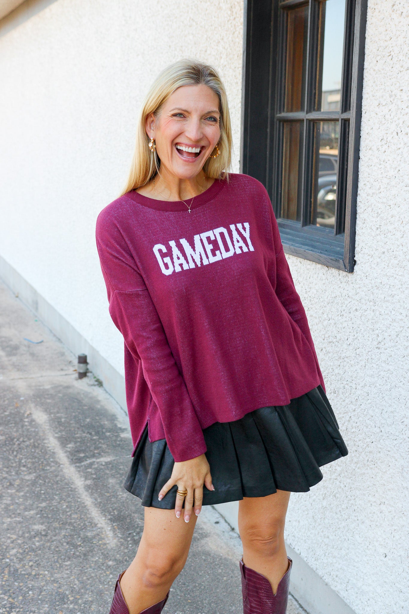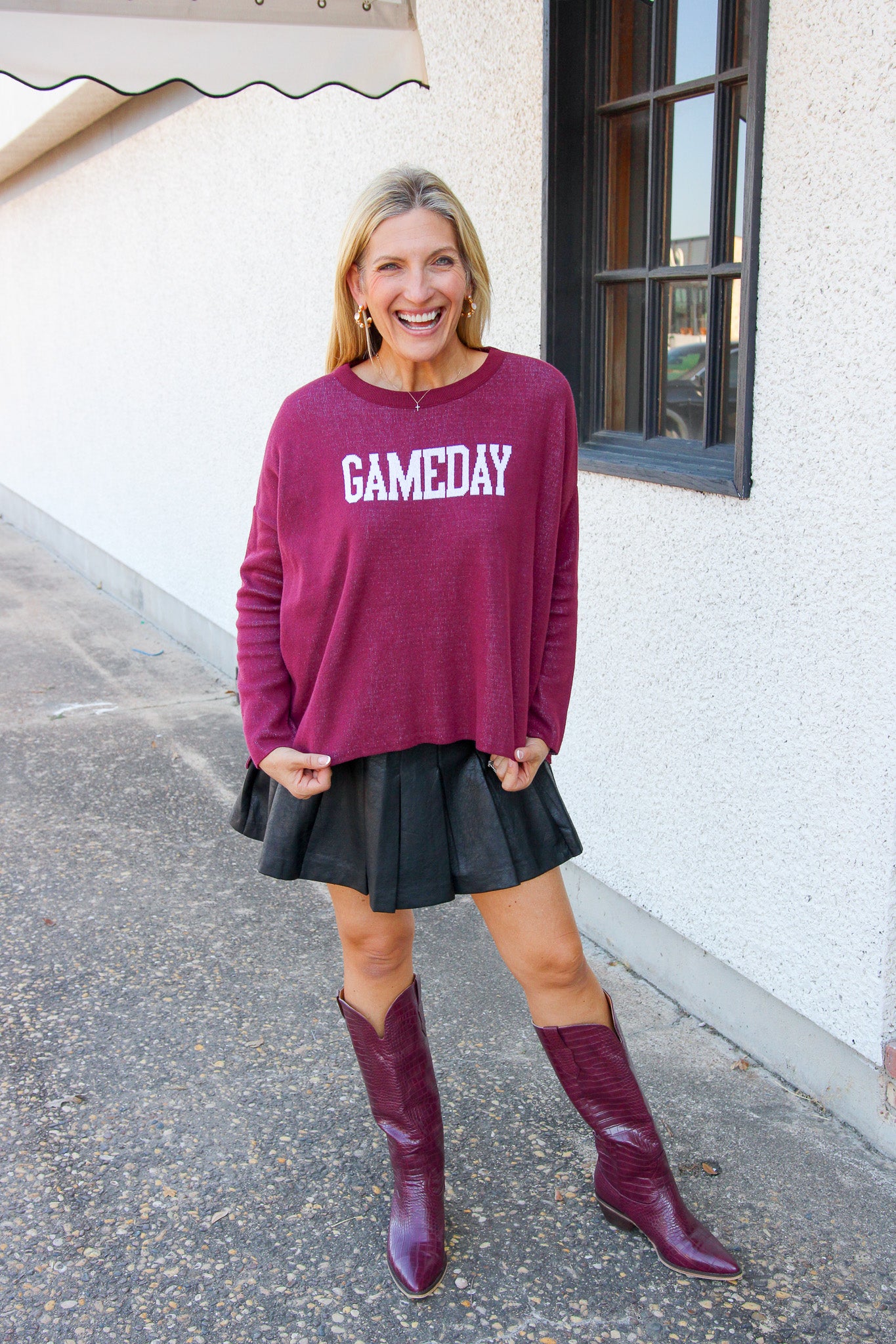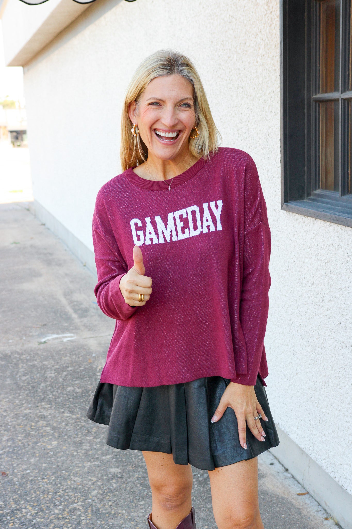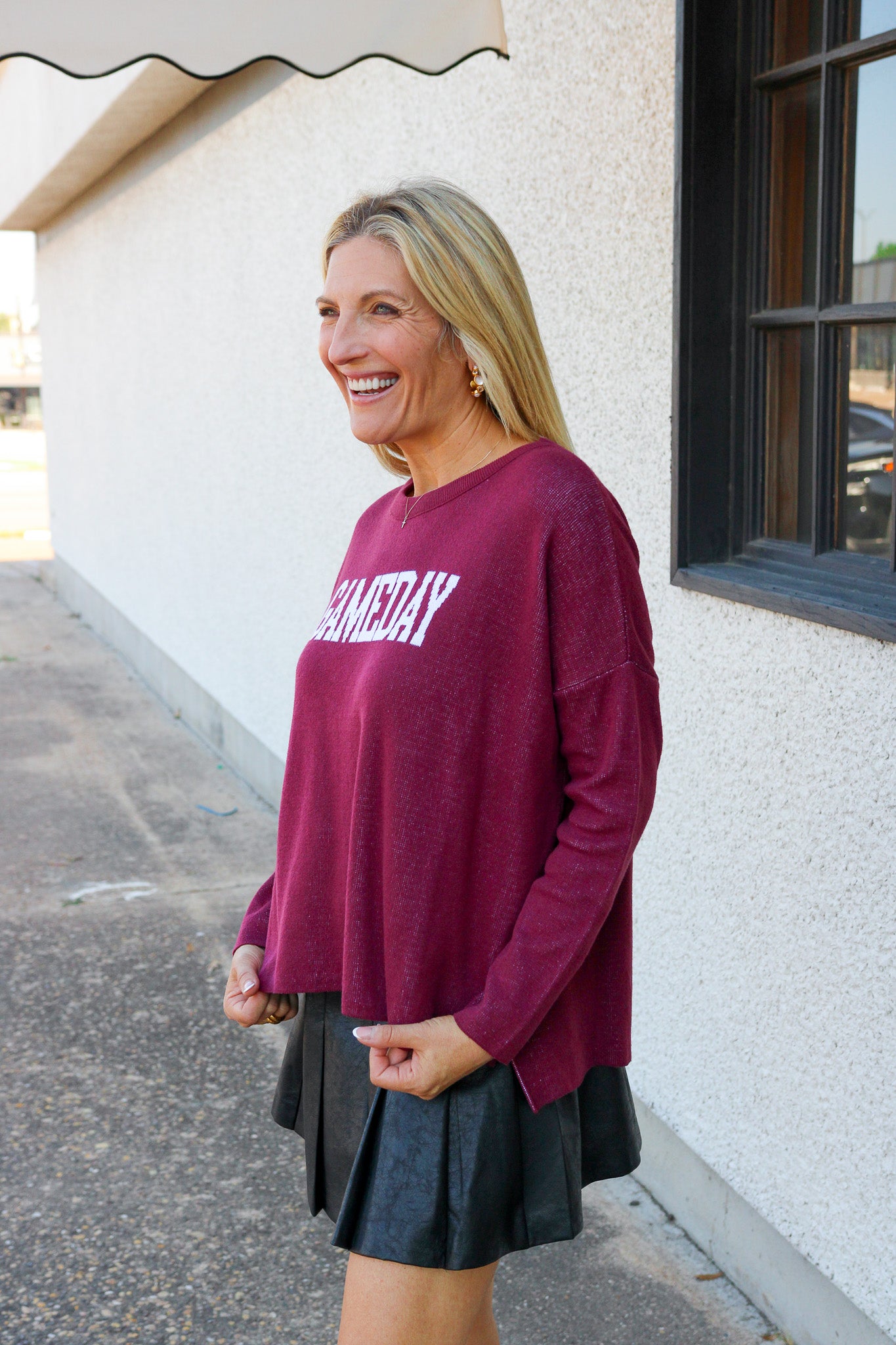 Get ready to show off your team spirit in cozy style with the Varsity Gameday Sweater in Maroon. Featuring classic athletic lettering, this sweater blends everyday comfort with a playful, relaxed vibe perfect for cheering on your favorite team or just kicking back. The rich maroon shade adds a bold pop to your casual look, making game day your new favorite day.