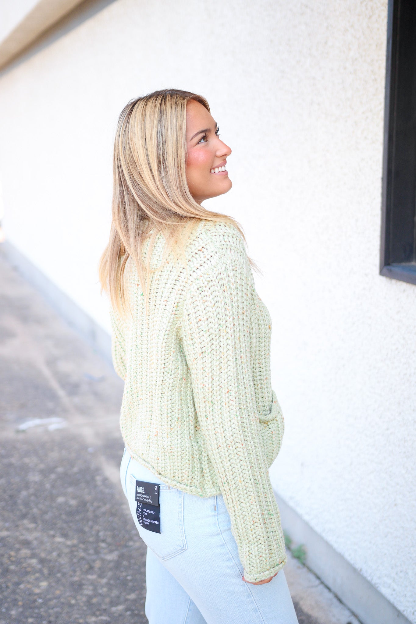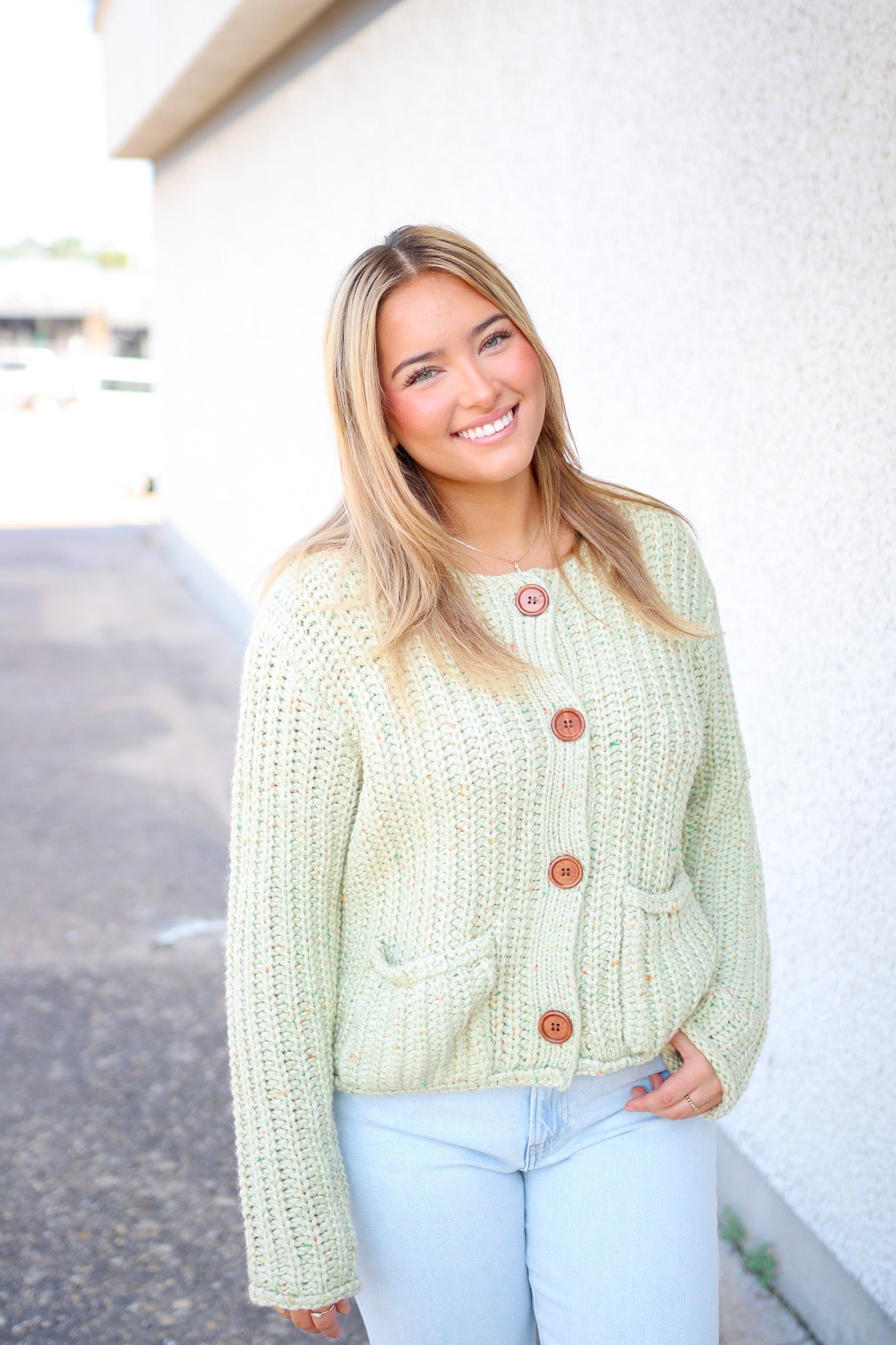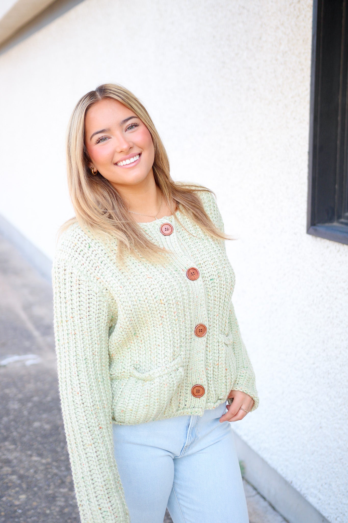 Embrace the crisp, autumn air with the "Went Apple Picking" Cardigan. This effortlessly cozy piece features a soft, chunky knit in a refreshing apple mint hue, reminiscent of a perfect fall day. Complete with natural-toned buttons and two convenient front pockets, it's the perfect layer for a trip to the orchard or a relaxing evening by the fire. It's the kind of cardigan you'll want to wear for every adventure, big or small.