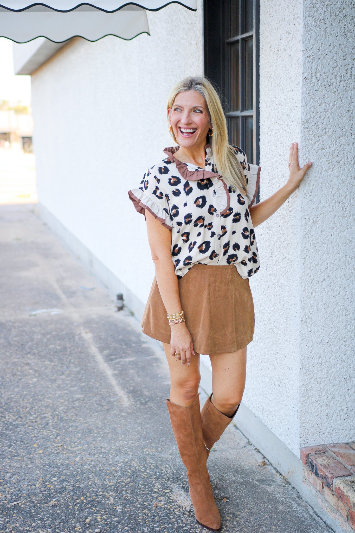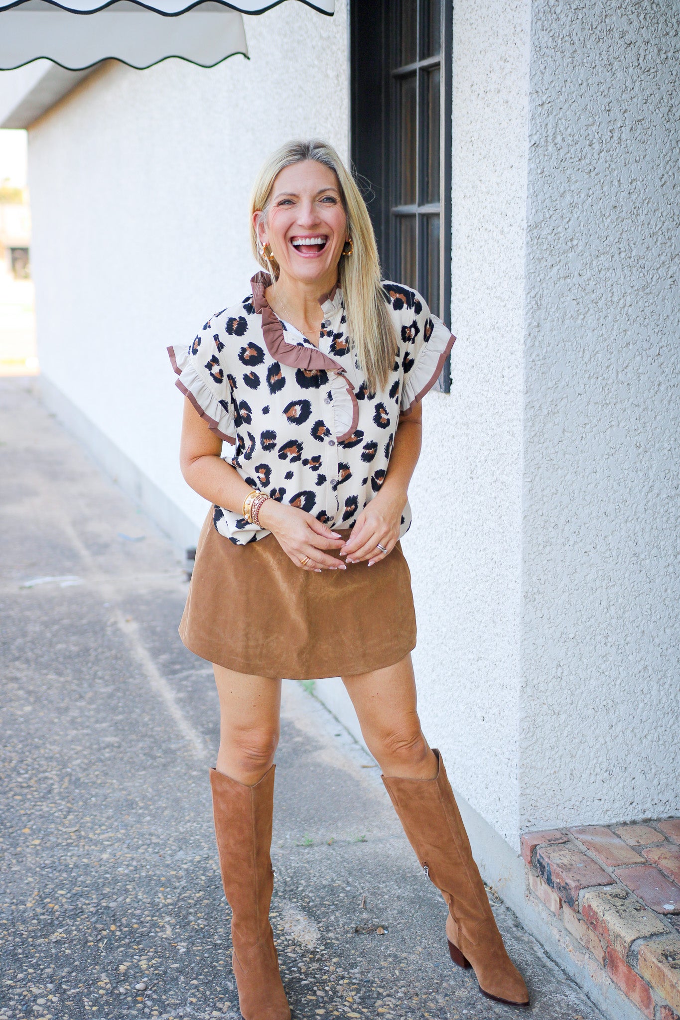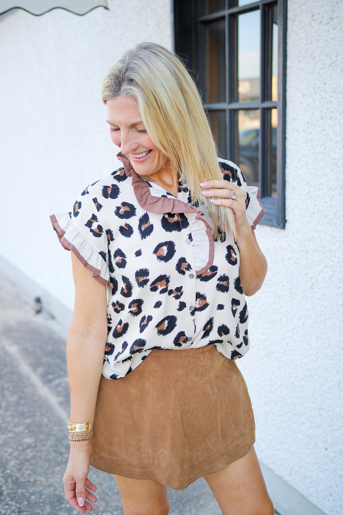Add a dash of wild charm to your wardrobe with the Wild Streak Blouse. This leopard print top features playful multicolor ruffle accents along the neck and sleeves, making every day feel like a fashion adventure. Lightweight and woven for comfort, it’s unlined and non-sheer, perfect for layering or wearing on its own. Embrace your bold side with this effortlessly fun piece.