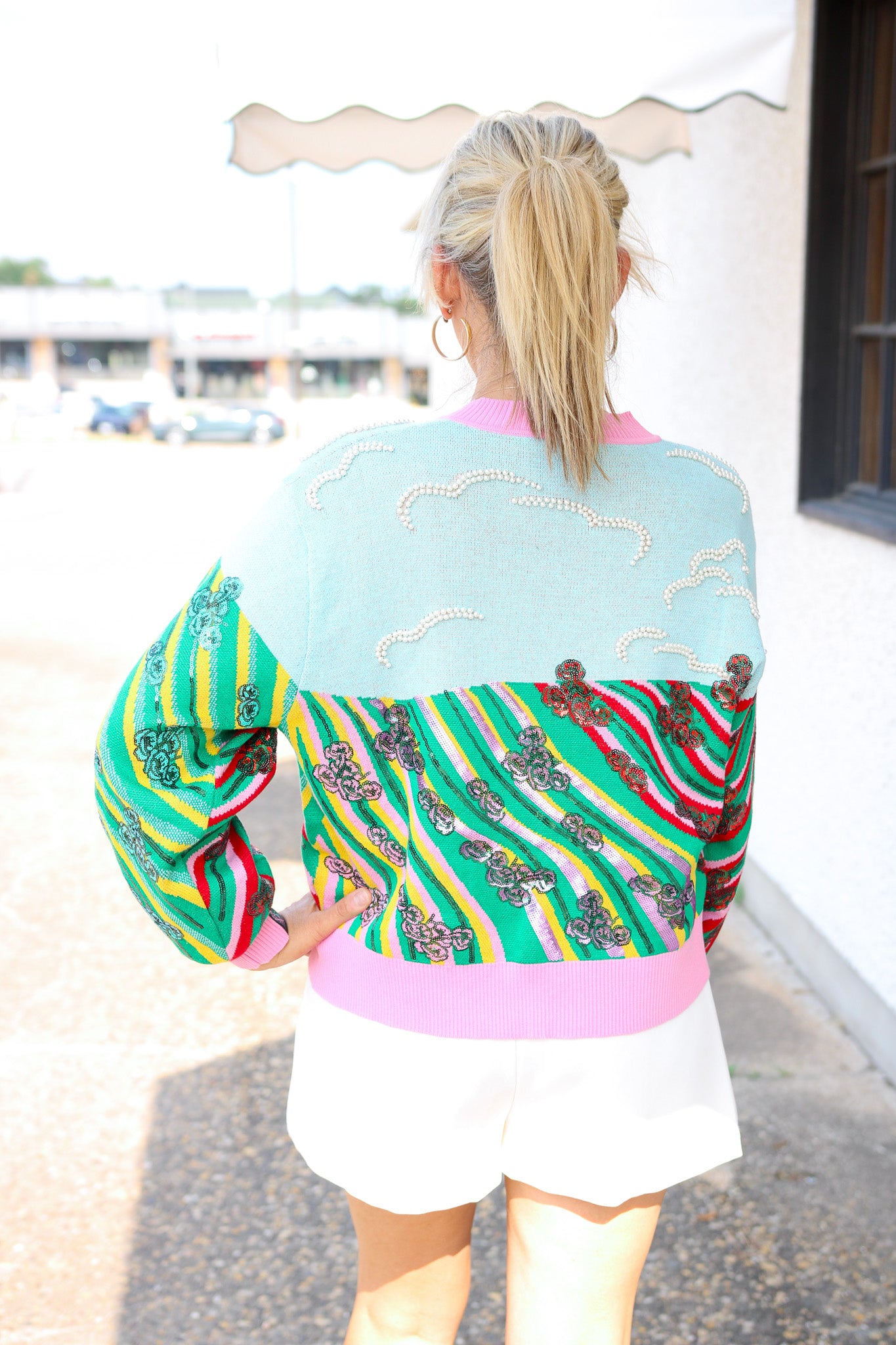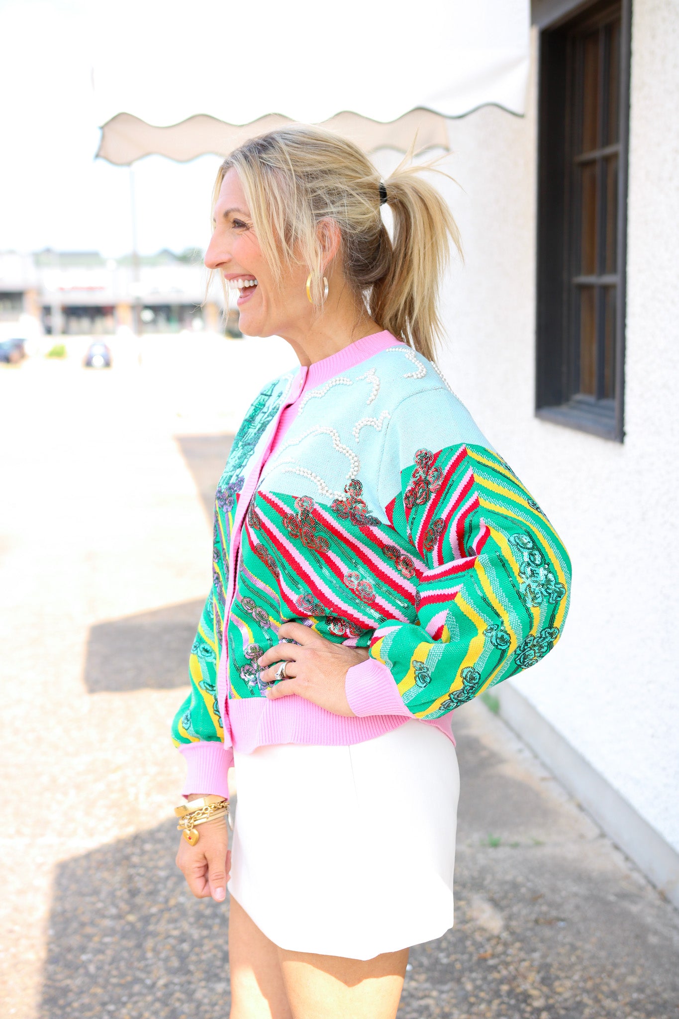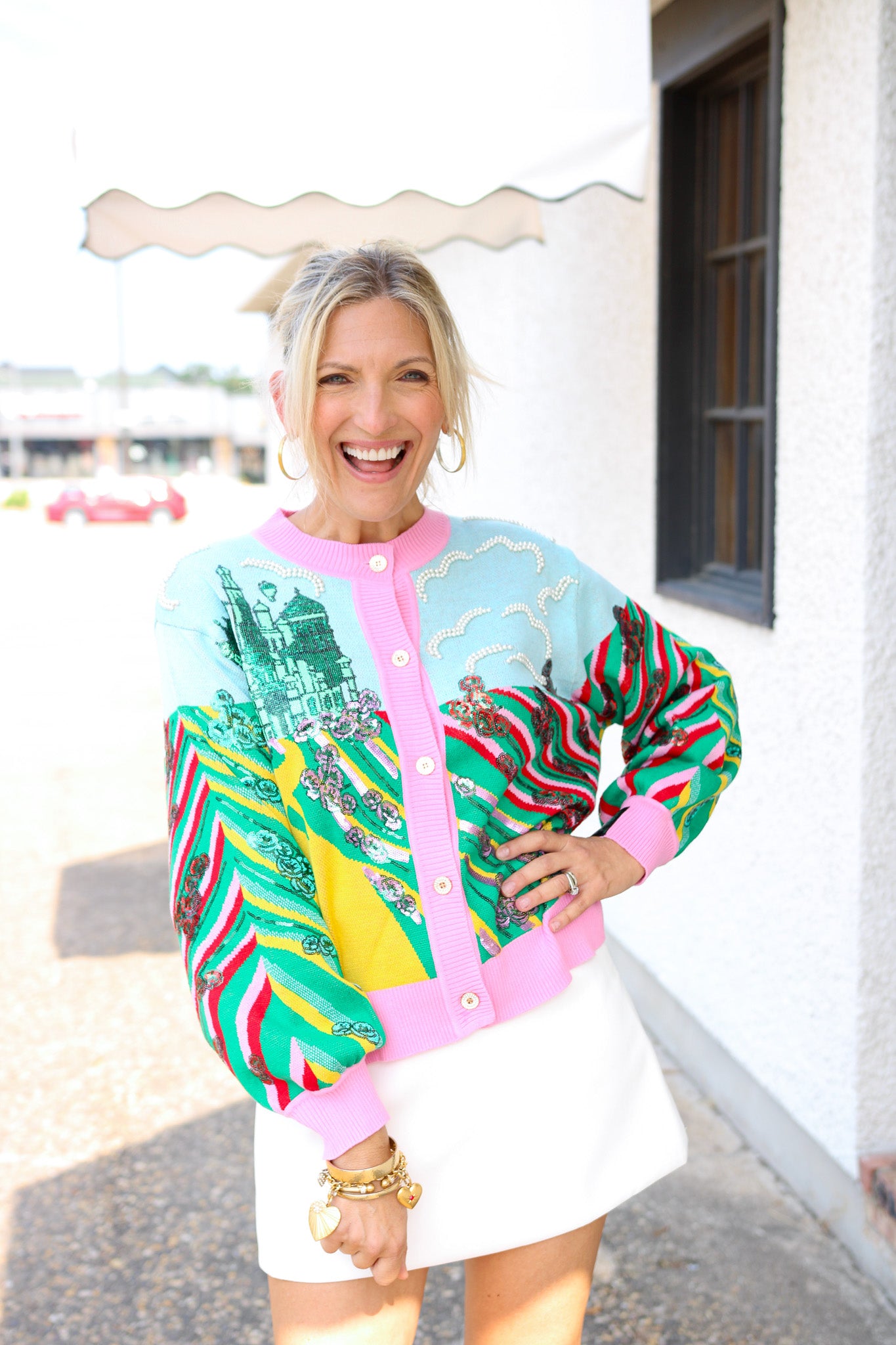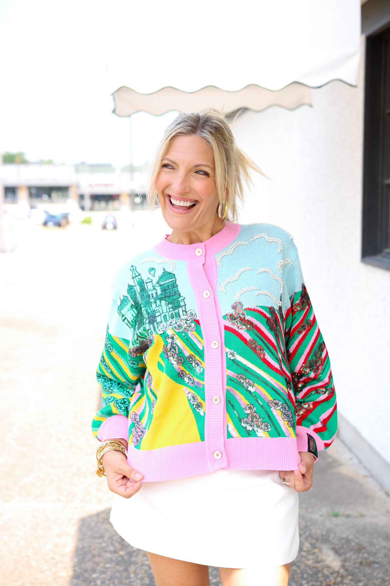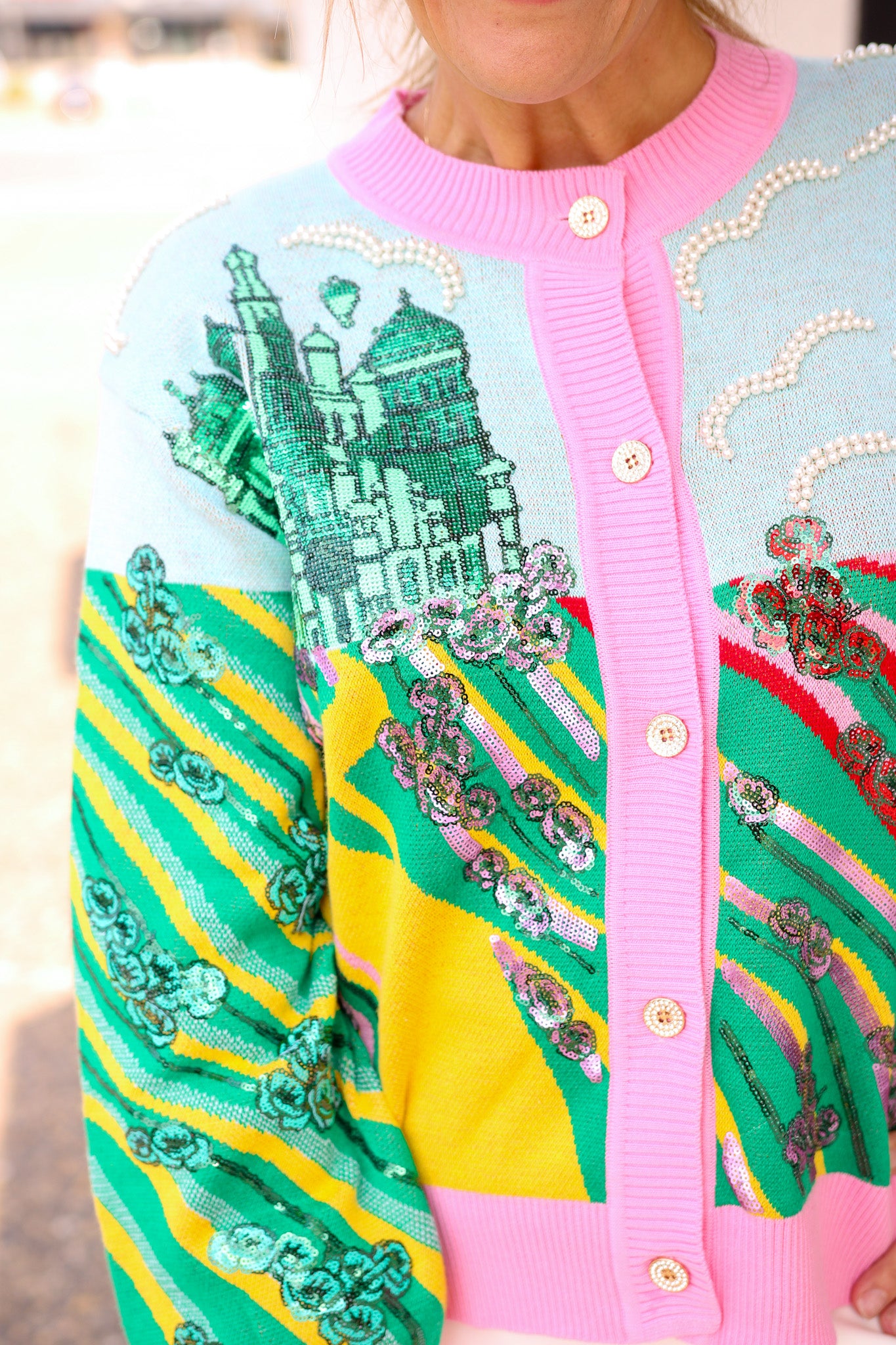 Inspired by the legendary path to the Emerald City, this button-up cardigan brings the magic of Oz to your wardrobe. Featuring a whimsical Yellow Brick Road design and comfy knit feel, it's perfect for fans of the classic tale. Pair with the matching skirt for the full magical look. Slightly oversized for a cozy fit.
