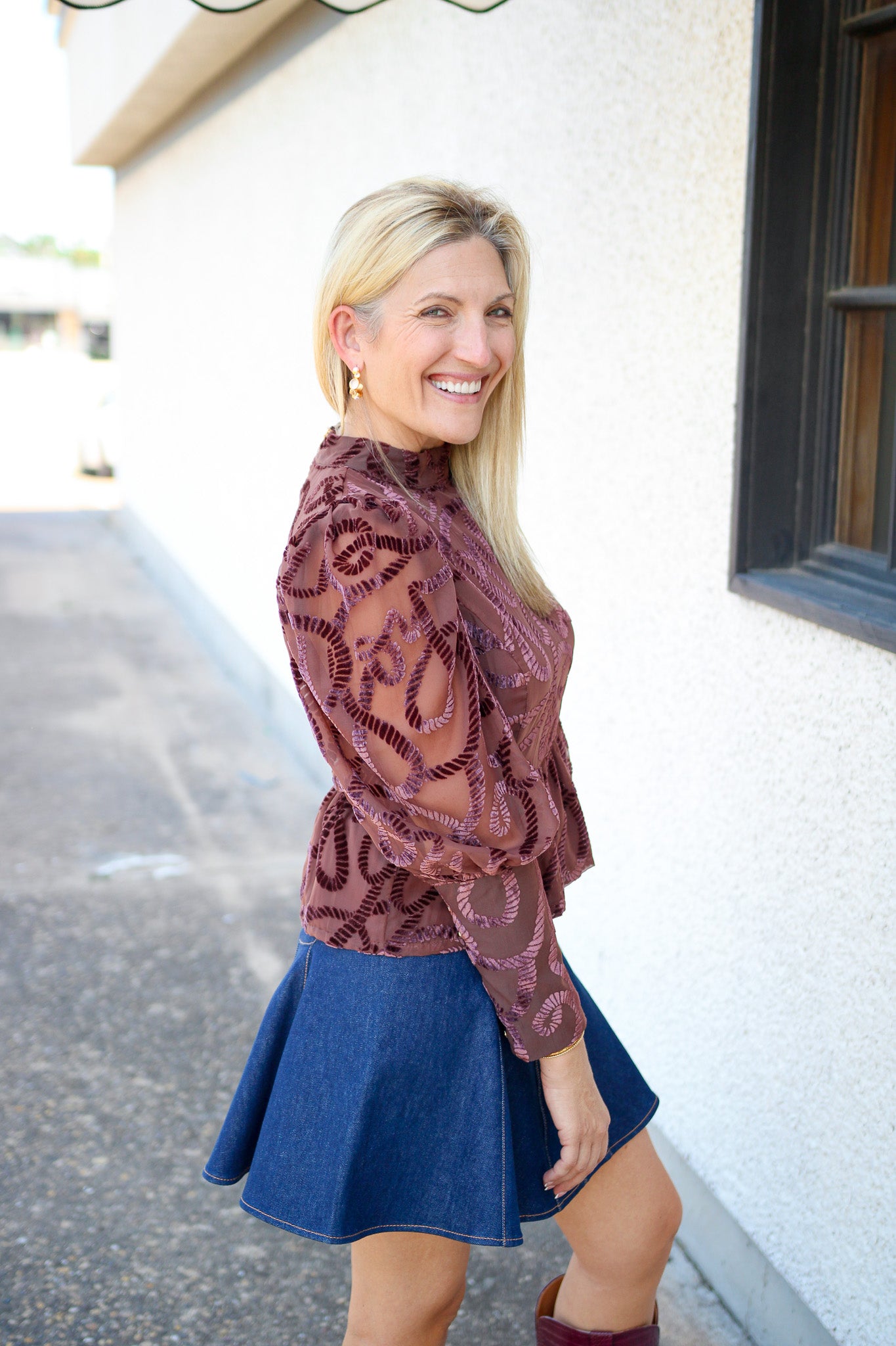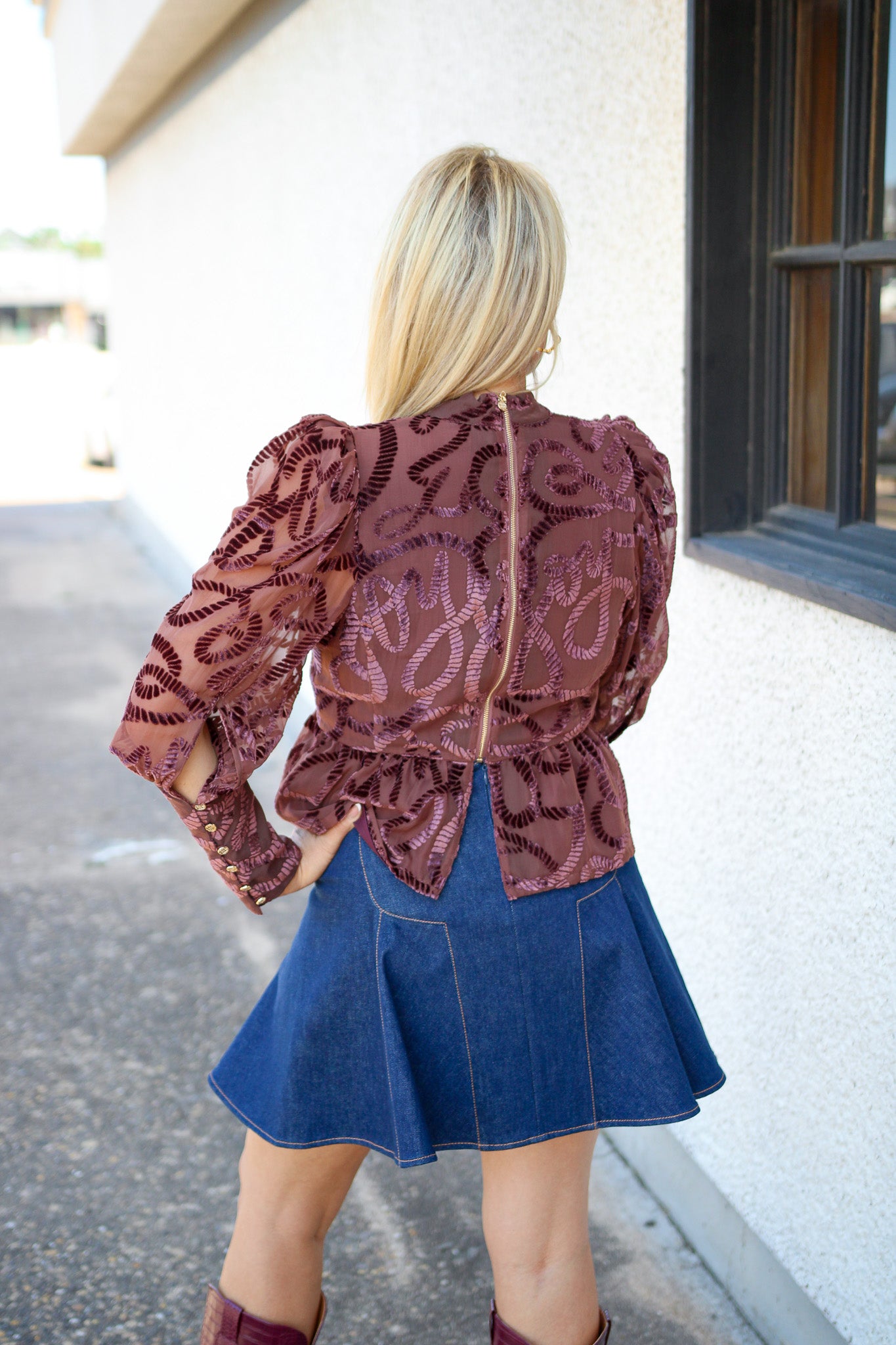 The Zoe Top in Rope is a striking blend of texture and silhouette, designed with voluminous puffed sleeves that taper into a slim fit for a dramatic yet wearable shape. A mock neckline, peplum hem, and back zip closure add polish to the feminine cut. The velvet rope motif spells out “JOY” across the fabric, a subtle nod to western-inspired detail that remains chic, unique, and elevated. Perfect for statement dressing, this top balances playful texture with timeless sophistication.
